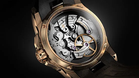 직경 45mm의 핑크 골드 케이스는 전면에서부터 모던하면서도 매혹적인 모습으로 모두의 시선을 사로잡는다. 기존의 7시 방향에 상징적으로 위치했던 플라잉 투르비용은 타임피스의 중앙에 자리 잡고 있다. 센트럴 투르비용의 아래쪽 케이지에는 티타늄을, 위쪽 케이지에는 미러 폴리싱 처리한 코발트 크롬 소재를 적용해 무게를 16%까지 경량화함으로써 자기장에 대한 저항력을 높였을 뿐만 아니라 파워 리저브도 72시간으로 최적화했다.