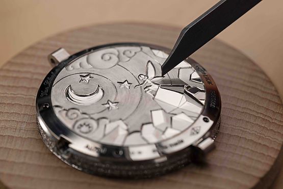 파소네 에나멜은 옐로 사파이어로 장식된 꽃밭에서 존재감을 드러낸다. 로즈 골드 아워 마커를 더한 록 크리스털 세팅과 장식용 스톤에 새긴 조각들이 세심한 디테일을 펼치며 이 장면의 신비로움을 더욱 완벽하게 표현한다. 눈부신 요정의 모습은 다양한 인그레이빙과 볼륨이 돋보이는 폴리싱 기법을 적용한 다이얼 뒷면에서도 매혹적인 이야기를 계속 이어간다.