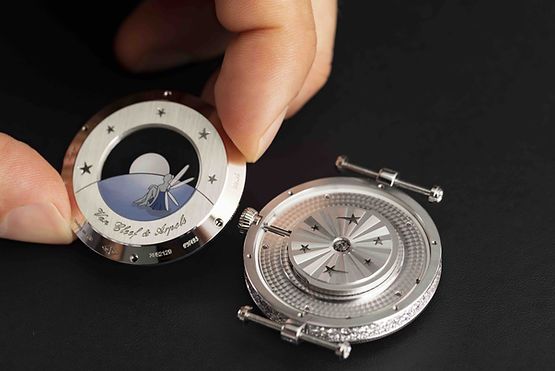 다이얼의 하단에는 지평선을 닮은 서정적인 공간을 배치해놓았는데, 직경 38mm 버전은 화이트 머더 오브펄로, 직경 33mm 버전은 블루 컬러를 입힌 머더 오브 펄로 제작하고 모두 기요셰 효과를 더했다. 백 케이스와 로터에도 밤하늘을 장식했는데, 백 케이스 중앙의 사파이어 크리스털 위에는 에나멜 데칼 기법을 사용해 수호의 요정을 그려넣었다. 사파이어 크리스털의 에나멜 데칼은 오랜 기간 동안 이어온 노하우로, 인그레이빙 작업과 함께 조화를 이룬다. 사파이어 크리스털에 30~36겹에 이르는 에나멜 코팅을 더해 완성하는 이 기법은 온도와 소성 시간을 조절하며 완벽한 균형을 맞추는 복잡한 과정을 거쳐야만 비로소 완성할 수 있다.