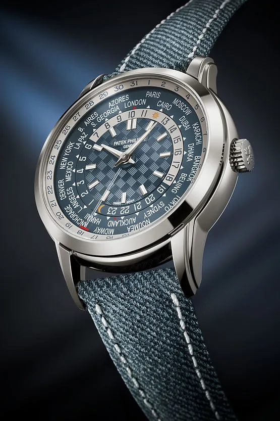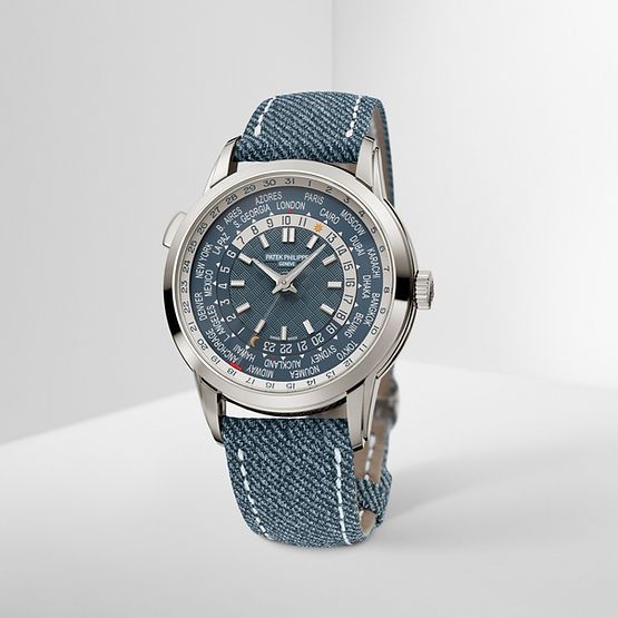 1930년대 루이 코티에가 고안한 장치를 적용한 파텍 필립의 월드 타임은 브랜드를 대표하는 컬렉션 중 하나다. 올해 파텍 필립은 블루 그레이 다이얼과 데님 무늬의 스트랩으로 한층 젊은 감성을 드러낸 월드 타임 위드 데이트를 새롭게 선보였다.
