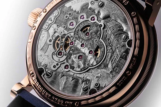 시계의 뒷면 역시 놀라움을 선사한다. 이전 모델에는 아브라함-루이 브레게가 일평생 몸담으며 시계를 제작해온 파리 시테 섬의 퀘드올로지(Quai de l’Horloge) 39번가의 공방 건물의 정면을 수작업으로 새겨넣었다. 반면 클래식 더블 투르비용 “퀘드올로지” 5345의 플레이트에는 아브라함-루이 브레게의 워크숍을 위에서 내려다본 모습으로 표현해내며 전보다 입체적인 디자인을 완성해냈으며, 인그레이빙 작업에만 최소 100시간이 소요되었다.
