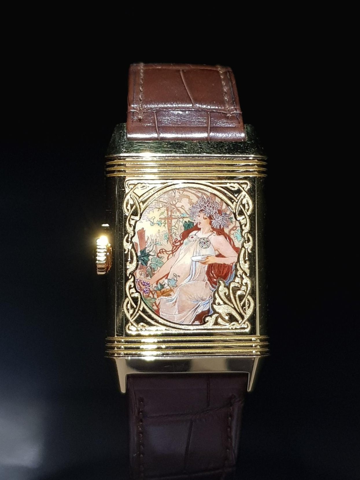 그동안 예거 르쿨트르가 만들어 온 리베르소 일부. 마지막 피스엔 알폰스 무하의 그림이 에나멜로 그려졌다. 사진=oldschoolwatch