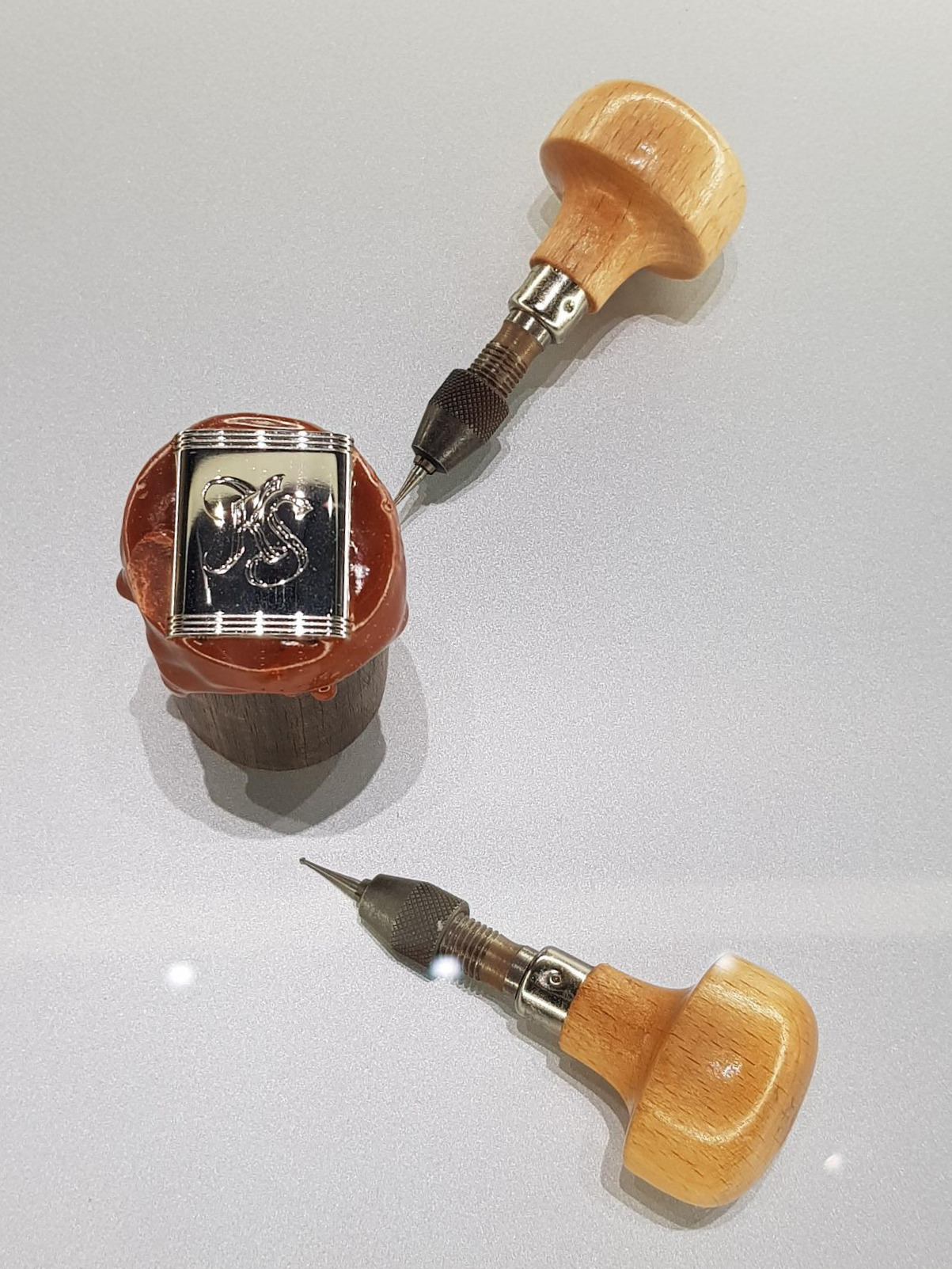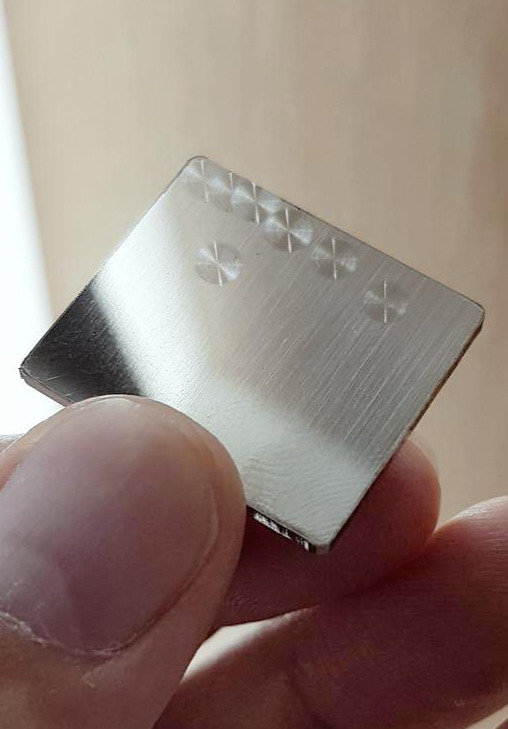 왼쪽 사진 우측 하단에 회색 레버를 누르면 바로 위에 있는 작업대에 드릴이 내려오면서 패턴을 만든다. 오른쪽은 대충 찍어본 결과물인데, 자세히 보면 원마다 크기가 조금씩 다르다. 너무 약하게 누르면 패턴이 아니라 기스만 나고, 반대로 너무 세게 누르면 원이 커지거나 나아가 드릴이 박힌다고.