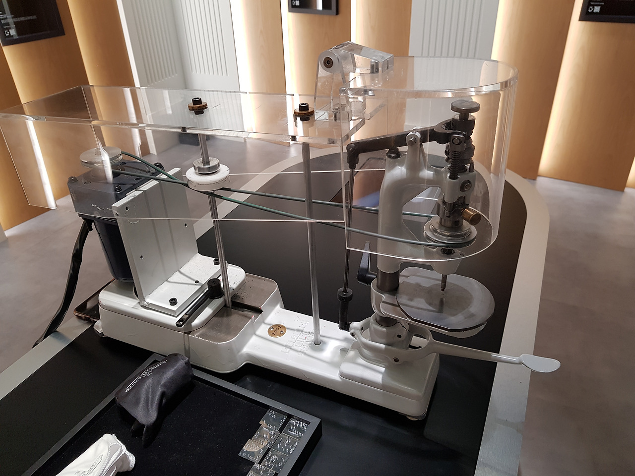 볼거리가 충분히 많은 전시지만, 특히 인상깊었던 건 페를라주 드릴 프레스. 스위스에서 직접 페를라주 기계를 가져와서 체험해볼 수 있었다. 페를라주는 무브먼트의 브릿지나 플레이트 등에 동그란 패턴을 일정한 크기와 간격으로 찍어 다양한 형태의 패턴을 만들어내는 마감 처리를 말한다. 미적인 기능도 크지만, 과거 금속 가공 기술이 발달하지 않았을 때 철가루 등이 기계 부품을 고장낼 수 있어 마감 차원에서 사용하기 시작했다는 이야기도 있다.