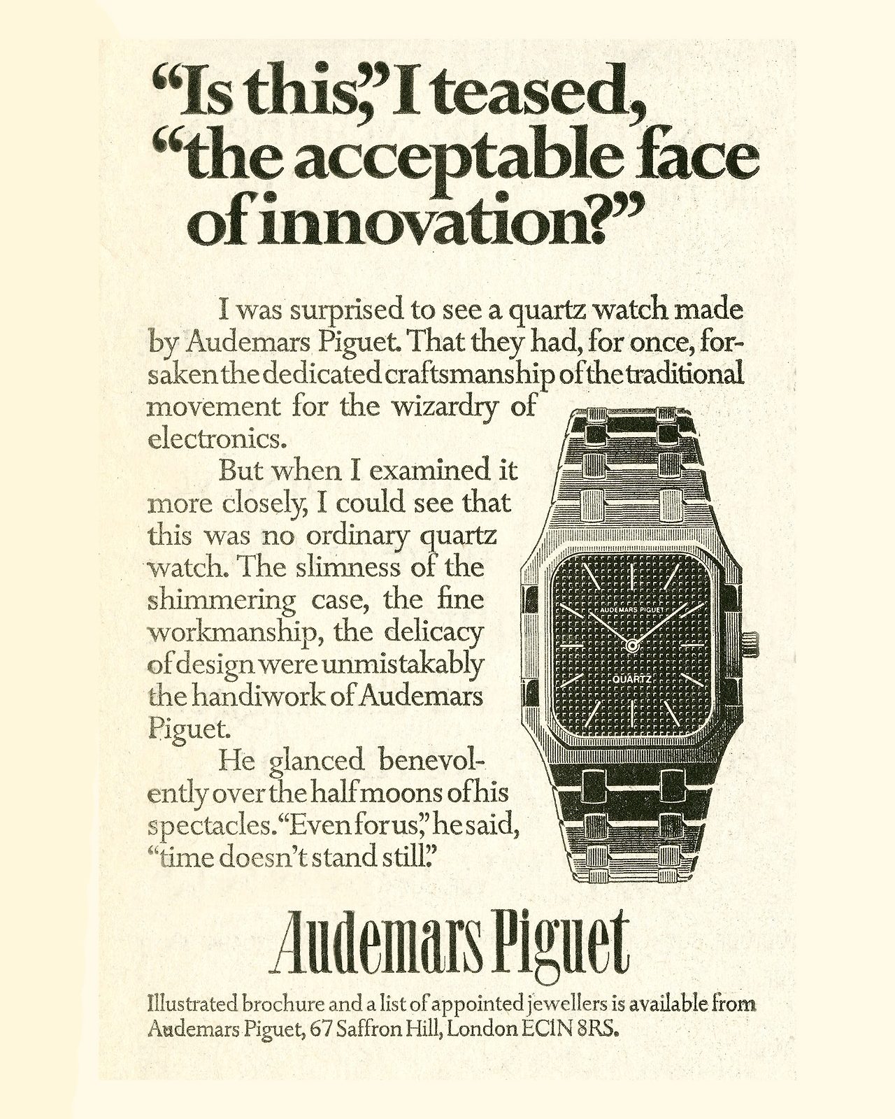 실제로 당시 오데마피게를이끌었던 자크 루이 오데마(Jacques-Louis Audemars·Chairman)와 조지 골레이(Georges Golay·Managing Director)는 쿼츠 시계로 기계식 시계 브랜드들이 줄줄이 무너졌던 쿼츠파동 때에도 오데마피게에 몸담았던 이들인 만큼, 로얄오크 쿼츠 버전의 탄생을 가능한 늦추고 싶어했다고 합니다.
