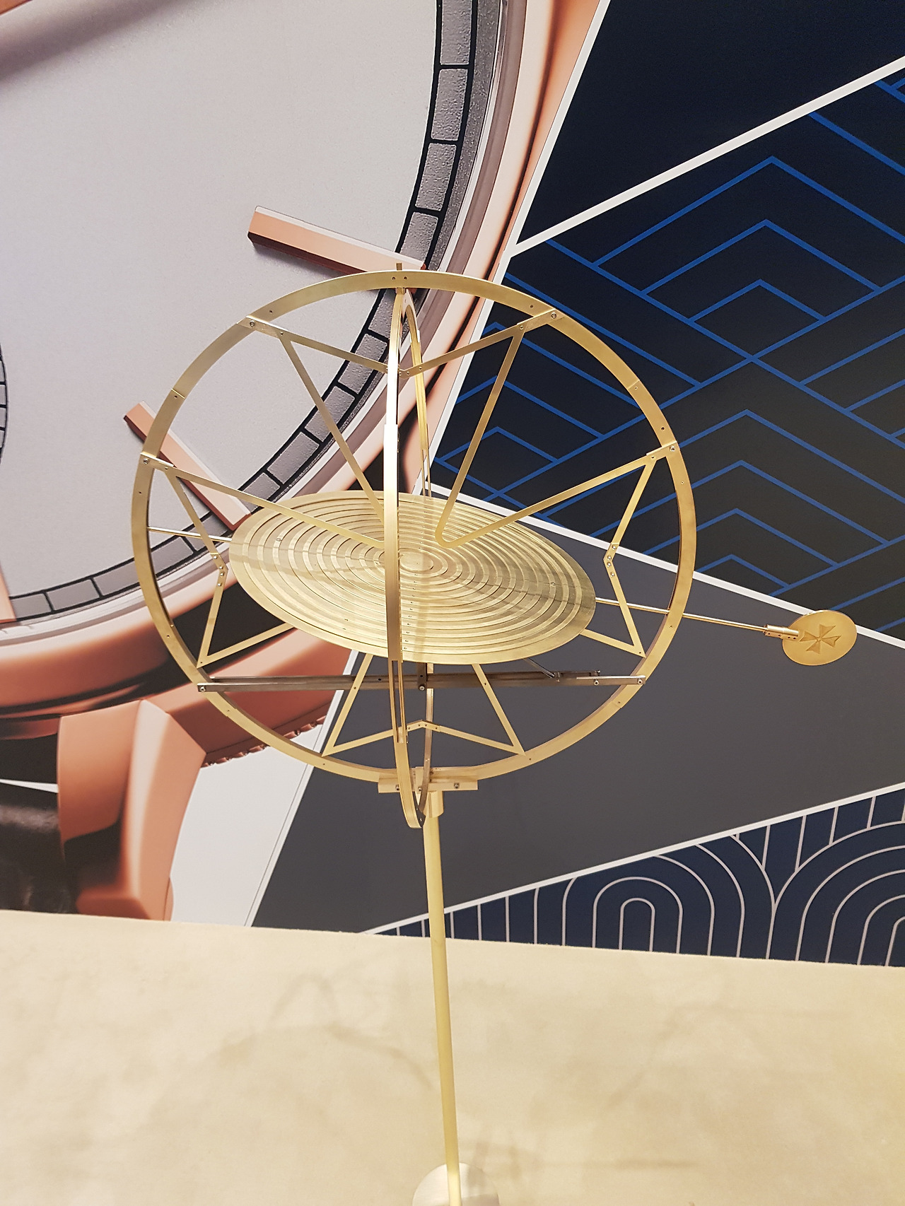 이 외에도 레트로그레이드 등 다양한 모델이 소개됐는데, 행색이 민망해서 급하게 나오느라 사진을 못찍어왔다. 대신 스마트폰을 뒤져보니 아밀러리 투르비용 모형을 찍어왔다. 천문학자들이 쓰던 혼천의(아밀러리) 모양으로 만든 투르비용이다. 두개 축으로 회전해 중력으로 인한 오차를 줄이고, 캐리지에 바쉐론 콘스탄틴의 상징인 말테 크로스 엠블럼을 새겼다. 회전 속도는 15초마다 정렬되는 정도. 바쉐론 콘스탄틴의 말테 크로스에 얽힌 정말 재밌는 이야기가 있는데 이건 분량이 좀 필요해서 나중에 풀어야겠다.