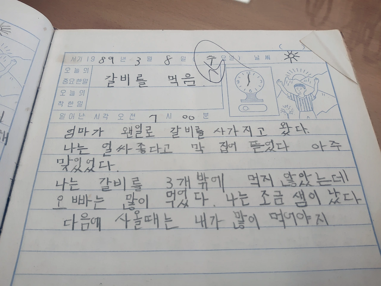 나에게는 초등학생 때 쓴 일기장이 있다. 친정에서 보관하다가 우리 반 아이들에게 읽어주려는 생각에 언제부터인가 일기장은 학교, 내 교실에 있다. 학년 말 짐을 챙길 때 가장 먼저, 소중하게 챙기는 보물이다. 일기는 2학년, 88년 9월부터 6학년 말, 93년 2월까지 썼는데 모두 14권이다. 6학년 때 쓴 일기가 5권으로 가장 많고 2학년 일기는 1권이다. 2학년 일기장 공책 값이 110원이고 마지막이 200원이다. 공책 값만큼 내 글씨도 조금씩 변해있는데 6학년 때의 글씨는 지금과 크게 다르지 않다. 가끔 지금의 나보다 더 잘 쓴 글씨도 보인다. 2~3학년 때 일기 줄거리는 주로 친구와 논 이야기다. 고무줄놀이, 롤러스케이트 타기, 그네 타기, 술래잡기 등 어디서 무엇을 했는지 쓰고는 대부분 ‘즐거운 하루다, 재미있었다.’로 끝났다. 가족 이야기도 더러 있는데 시장에 간 이야기, 엄마 심부름하기, 할아버지 댁이나 사촌 집에 간 일이 많다. 특히 친구 집을 갔을 때 그 집에 피아노가 있었다거나, 아파트가 넓었다고 부러워했고, 가족과 시장에 간 일기에는 물건 종류와 값을 정확히 적어놓았다. 반공영화를 보고 쓴 일기에는 그 당시 우리나라가 정말 못 살았다는 걸 강조했다. 어렸지만 넉넉하지 않은 우리 집 살림을 이미 알아차린 듯 나는 돈과 경제에 관심이 많았다. 4학년 때 일기는 시나 노래 가사가 꽤 쓰여 있다. 동화책을 읽고 느낀 점도 많이 썼는데 일기를 쓰기 싫어하는 내 마음이 자주 보인다. 심지어 ‘일기를 잘 쓸 수 있는 방법은 없을까?’라고 일기 쓰기에 대해 대 놓고 고뇌한 페이지도 있다. 선생님이 덧글은 고사하고 ‘참 잘했어요’ 도장도 거의 없어 그리 힘들었을까 싶다. 5~6학년 일기는 확실히 이전보다 내용과 양에서 발전했다. 의성어, 의태어도 많고 혼잣말이나 대화도 많다. 도립도서관 선생님이 불친절해서 학생들이 한 명도 안 올 것 같다는 비판도 있고 나를 좋아하거나 내가 좋아한 남자 친구 이야기도 등장한다. 학교에서 시험을 다 끝내 ‘자유의 새’가 되었다던가 이 일기장을 ‘자신의 역사책’으로 정의하며 ‘영원히 남을 소중한 보물’이라며 예언했다. 특히 6학년 때는 한 편에 한 페이지를 꽉 채워야 하는 강박증이 있었는지 ‘우리들의 슈퍼스타, 강현정 나가신다’ 라던가 ‘어유, 이 멍청아! 정신 차려!’ 라며 굳이 안 해도 되는 솔직한 내면까지 쥐어짜 가며 페이지를 채우는 성실함을 보였다.
