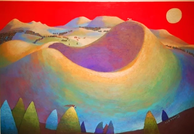 제주도립미술관에 만난 제주화가 김성옥의 <오름의 향기>에서 오늘 새벽에 마주한 장면을 보았다. 놀라 소리 지를 뻔! 담백해서 매력적인 태양, 온통 빨간 하늘, 해를 먹으려는 입 벌린 오름은 나였다. 내 몸 아래 푸르고 어두운 기운은 파도이자 내 불안이었다.