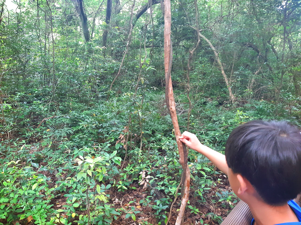 돌이 키운 곶자왈의 나무는 밑동이 초록이다. 크든 작든 나무줄기는 콩짜개덩굴의 고향이기 때문이다.콩짜개덩굴 잎은 나무 밑동에 초록 물감을 붓끝에 묻혀 점을 찍었다. 여린 콩을 반쪽 낸 듯한 잎은 나무에게 초록 옷이 된다. 나무가 좋아하든 말든 콩짜개덩굴은 위로 위로 계속 점을 찍는다. 사실 나무는 좋아하지도 싫어하지도 않는다. 나무는 태어날 때부터 덩굴의초록 비늘이 자기 옷인 줄 안다.