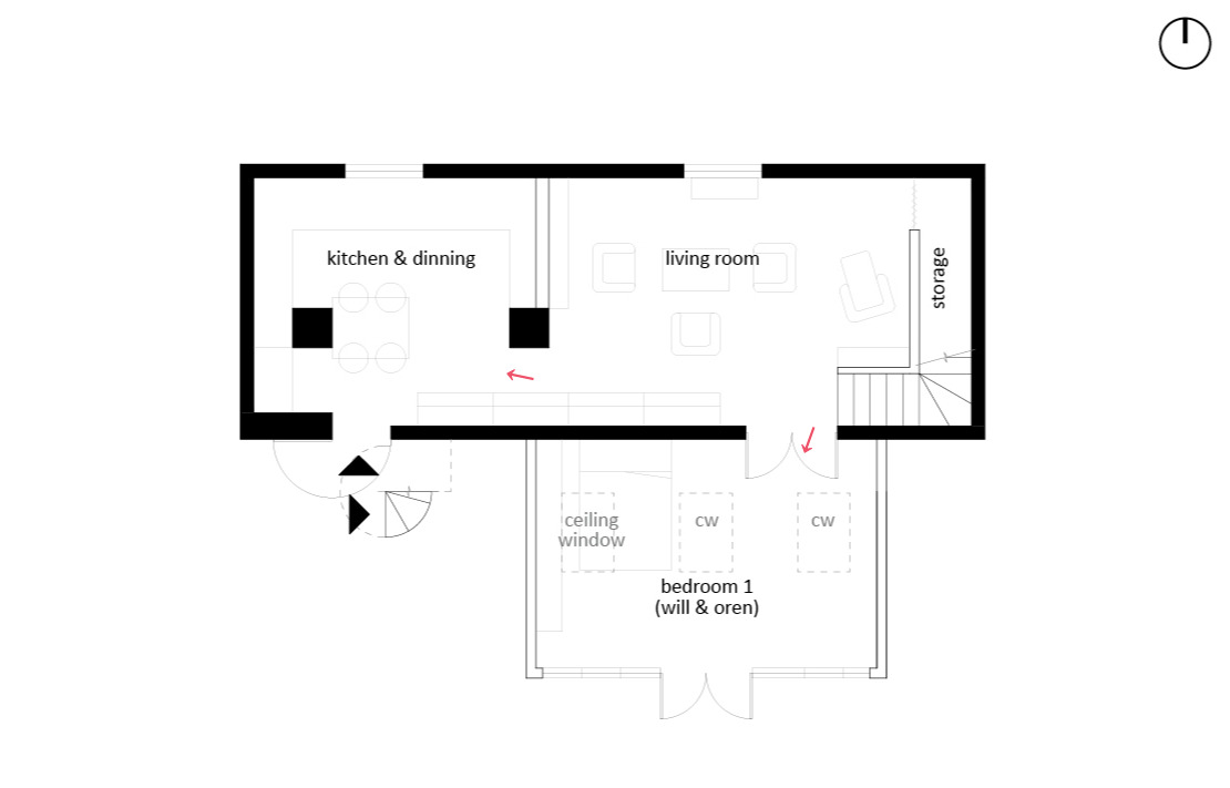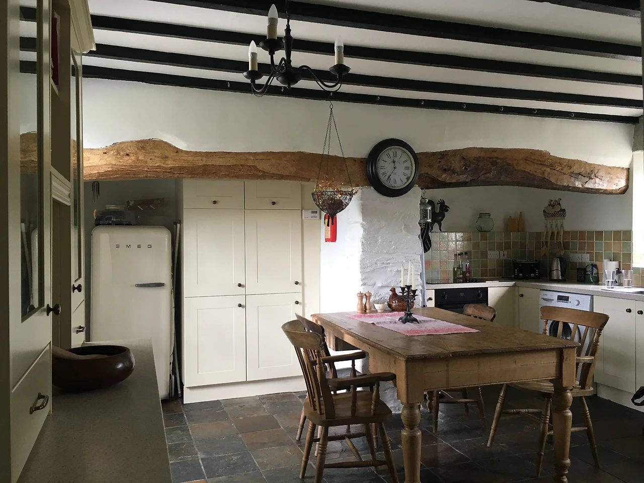 이곳의 1층은 주방, 거실, 발코니를 확장한 침실로 구성되어 있는데 튜더양식(Tudor 왕조 시대의 건축양식, 박공지붕과 직선의 검은 목재장식이 특징)이 내부 천장에 그대로 남아 있었다. 건축가인 엠마가 잉글랜드, 웨일스 지방에서 많이 볼 수 있는 양식이라고 했다. 바닥이 진짜 돌바닥이었다. 구조기둥과 천장의 장식을 그대로 살려 그 주변으로 싱크대를 두르고 선반을 배치한 것이 아주 좋았다. 조금 불편하겠지만 유럽에서는 불편을 조금 감수하면서 사는 것이 사람들 몸에 배어있다. 이 사랑채는 데미안의 어머니가 더 이상 사용하지 않고 에어비앤비로 빌려주는 용도로만 쓰인다고 했다. 이와 비슷하게 대들보가 남아있는 어떤 서귀포의 집이 겹쳐 보이니 웨일스도 가깝게 느껴졌다.
