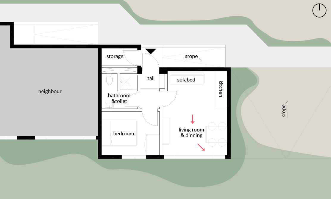 중심가와 조금 떨어진 곳의 이 집은 같은 평면이 뒤로 일정간격 이동하여 반복적으로 나타나는 타운하우스 같은 형식의 주거였다. 1-2인이 살기에 적절한, 방 하나, 거실하나의 공간이었으나 거실에 소파베드를 하나 더 두고 최대 3인을 허용하는 에어비앤비로, 사라는 운영하고 있었다. 나와 곰은 더블침대가 있는 안방(bedroom)에서 자고 시내는 거실의 소파베드에서 지냈다. 거실은 남과 북의 지면의 높이가 1.5M가량 차이가 나서 남쪽(도면 아래)은 반정도 땅에 묻혀 있었는데 외부가 탁 트여있고 정원으로 꾸며져 있어 불쾌한 느낌 없이 상쾌했다. 에너지 효율을 극대화하기 위해, 남쪽으로 창이 많이 나 있고 북쪽으로의 창은 과감히 없앴다. 커다랗게 뚫린 남쪽 창을 통해 보이는 산과 하늘, 그리고 고양이들을 보며 우리는 시내의 시간에 맞춰 천천히 추위를 녹였다. 11월은 아이슬란드는 한국의 겨울에 익숙한 우리에게도 칼태풍과 비바람으로 공포스러울 만큼 혹독했기 때문이다. 그러나 어디든 실내에만 들어가면 반팔을 입을 수 있을 정도로 온기가 가득했다.