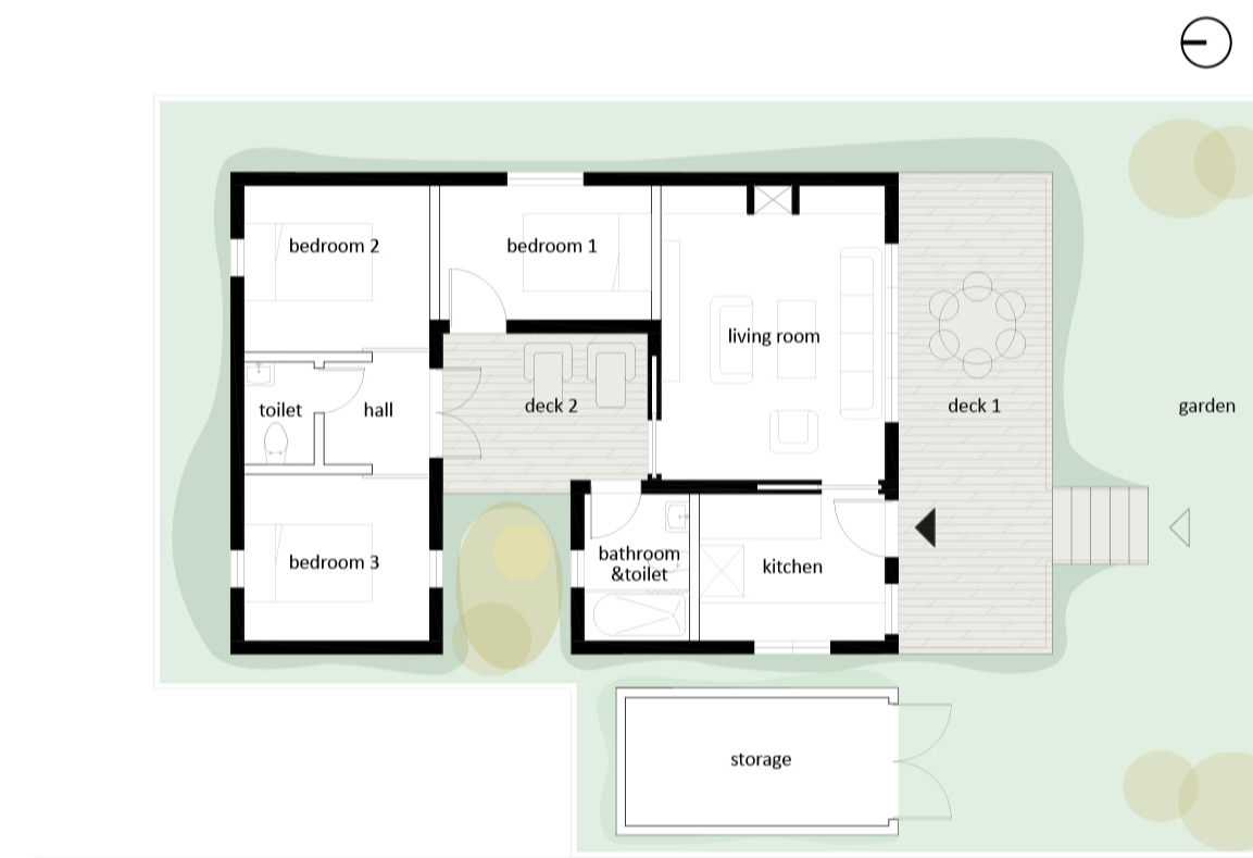 반면에 조금 불편한 구조도 보인다. 방에서 주방이나 거실로 가려면 외부(deck2)를 지나야 하기 때문이다. 여름에 주로 쓰이는 '써머하우스'라서 가능한 얘기일 것이다. 여름에 앞마당 뒷마당을 오가며 다른 방향의 바람을 느끼고 비를 맞아본 사람이라면 공간마다 달라지는 와인의 향과 맛을 탐구하는 시간들을 감사해할 것이고, 이 집을 떠나 파리로 돌아가서 그것들이 아주 간절해질 것이다. 그래서 장과 캐롤라인이 주말에 시간을 내서, 여름을 통째로 비우고 이곳으로 찾아오는 것일지도 모르겠다. 이 집의 모든 마당에서 달라지는 와인을 맛을 알아채기 위해서. 이렇게 같은 목재로 데크를 마감하고 비슷한 조경이 있는 두 공간이, 앞과 뒤의 마당으로 나눠지며 이렇게 공적 마당(deck1)과 사적 마당(deck2)으로 다른 성격을 갖게 됐다.