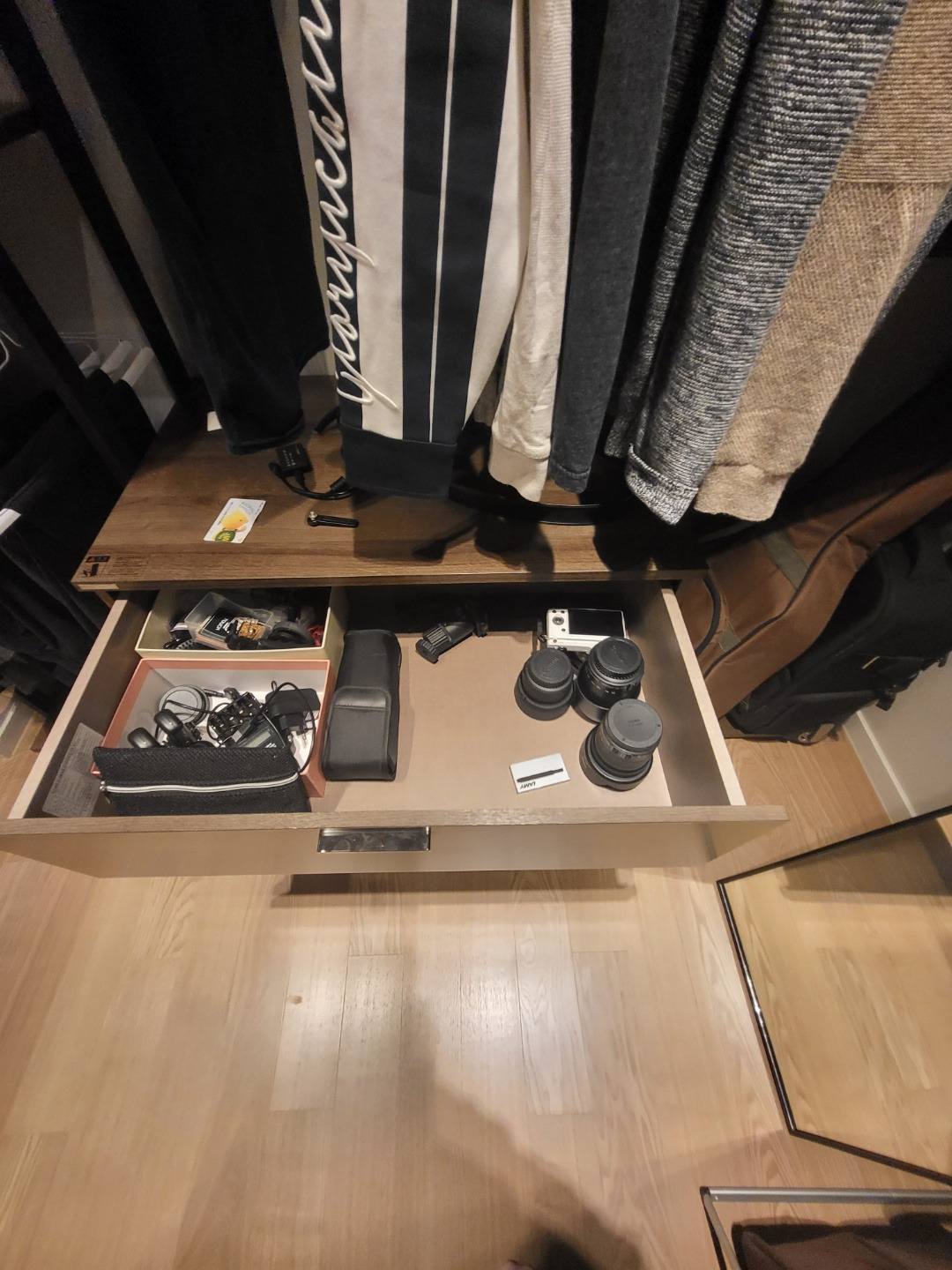 여기서 숨겨진 공간을 공개하려고 한다. 바로 신랑의 취미를 위한 공간이다. 서랍 안을 옷으로 채우지 않고 카메라로 채웠다는 비밀. 드레스룸 아래 공간을 옷걸이를 두지 않고 기타를 놓았다는 사실.