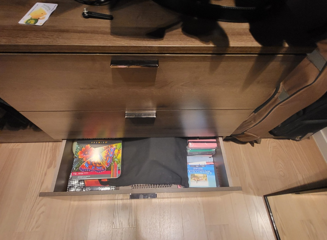 여기에 신랑의 배려로 나의 취미인 미술도구들도 주소가 생겼다. 이 서랍을 열면 나의 취미를 즐길 수 있게 된다. 남편의 드레스룸에 숨겨진 비밀공간이다.