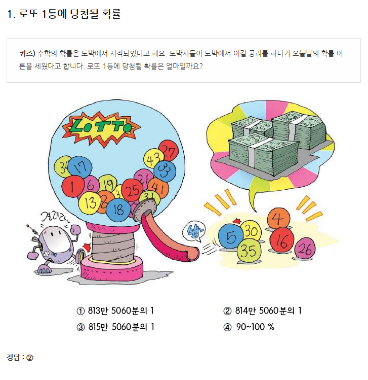 저의 대답은 예상하셨겠죠? 복권을 살 돈이면, 다른데 쓰는 게 더 낫다고 생각한다고 대답했죠. "나 통계학과 나왔어." 이러면서 말이죠. 복권 1등에 당첨될 확률은 매우 매우 희박하다고.