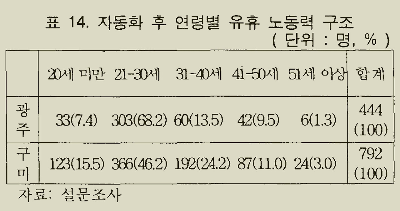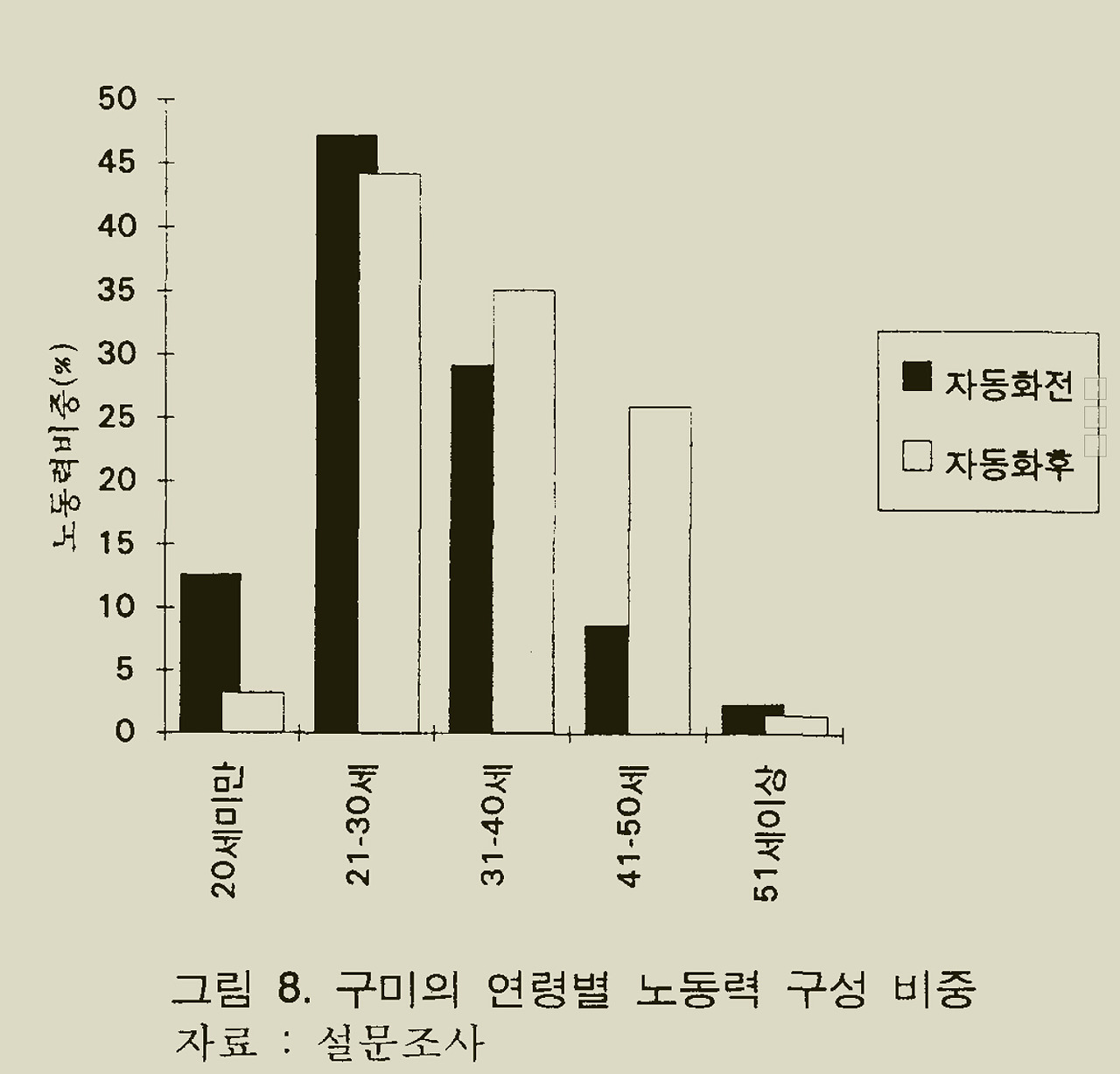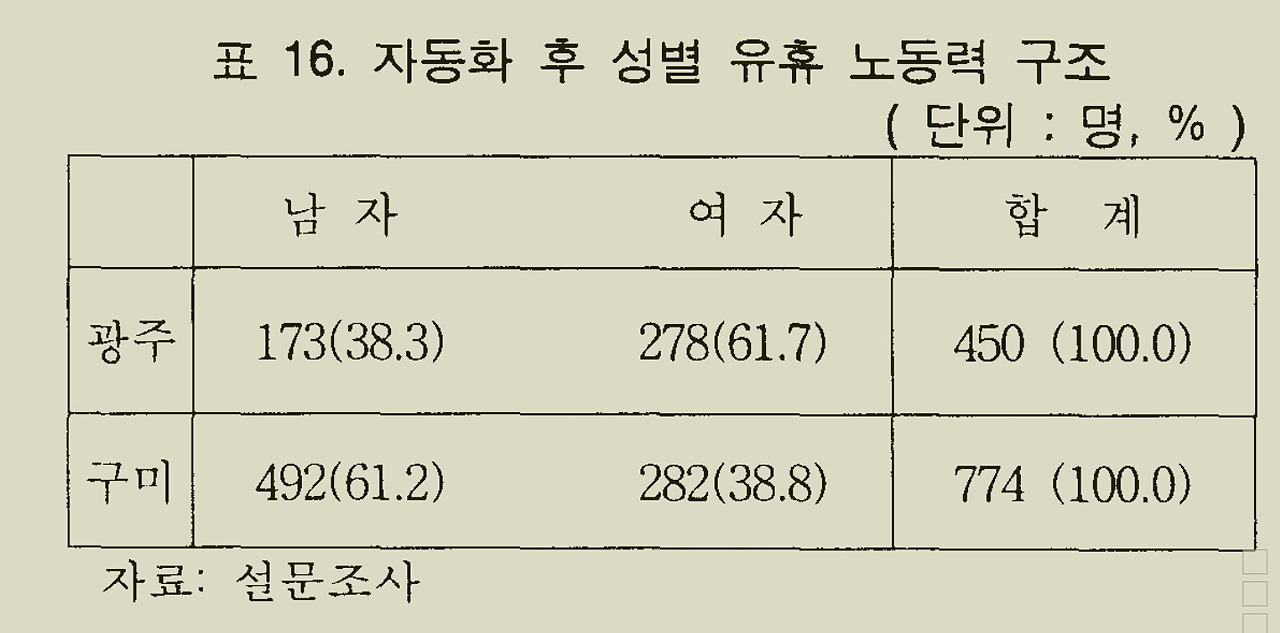 자동화 전후로 변화는 생산직은 줄어들고 연구개발직은 높아졌으며 상대적으로 중간간부가 많아졌다. 이는 현재의 모습과 매우 유사하다. 생산직이 아닌 연구개발직에서 사원들을 찾아보기 힘들고 40대의 중년 부장급들이 30~40%를 구성하고 있다. 또한 이 논문에서는 자동화 장비를 대응하는 인력이 여성인력보다 남성인력이라는 측면에서 자동화는 성적 불균형도 만들고 있었다.