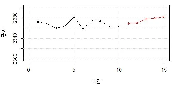오늘이 2017.6.16일이니 2017.6.18~2017.6.12까지의 코스피지수가 아래 빨간색으로 예측되었다.