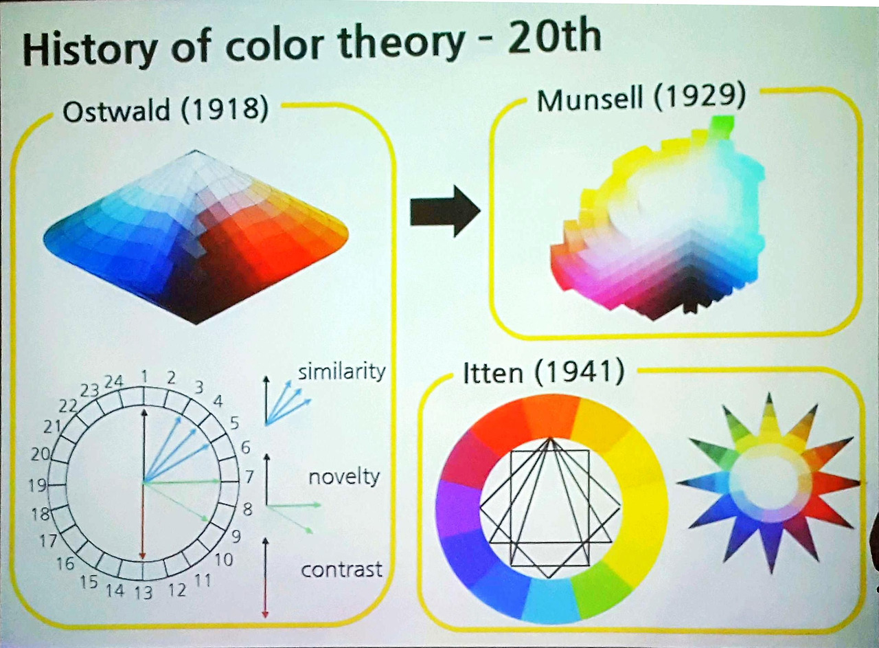 이때 한 가지 색 주변에 어떤 색들이 존재하는지에 따라 인간은 비슷함, 새로움, 대조적임 등등의 감정으로 작품을 멋있다고 느낀다고 한다.
