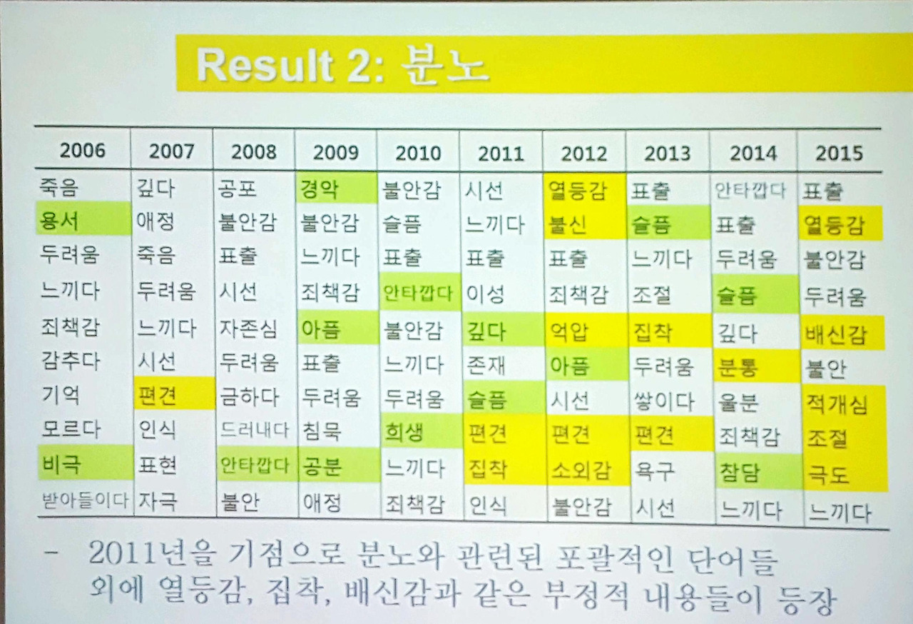 17만여 건의 기사들을 시대별로 분류하고, 주요 키워드를 중심으로 어떤 단어들이 기사로 쓰였는지를 분석한 후 분노라는 단어와 연결된 기사 내용으로 우발적으로 발생하는 경우가 많다는 것을 밝혀냈다. 요즘 묻지마 범죄가 치밀한 계획에 의해서가 아니라 사소한 시비로 우발적으로 생겨나는 경우가 많은데, 사회 분위기와 '분노'의 감정이 내재되어 있는 현대인들을 설명하는 내용 같아 재미있었다.