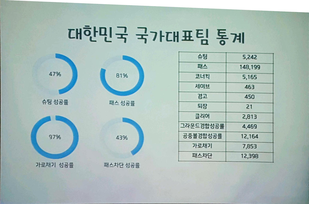 어떤 선수(포지션)가 어떤 위치에서 어느 시각에 어떤 이벤트를 했고, 그것이 성공했는가 실패했는가를 빅데이터 분석한 내용은 그 방법뿐 아니라 국가대표 선수들의 공격 패턴을 어떤가에 대해 결과도 매우 궁금했다.