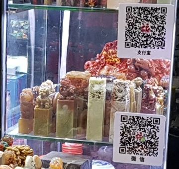 중국은 신용카드보다 현금이나 위챗 페이, 알리페이를 사용한다고 듣고 시험 삼아 위챗 페이 5만 원을 충전해갔다. 충전하는 방법은 우선 위챗을 깔고, 한국의 '아이러브코인'에서 충전했다. 환전 수수료가 없기 때문에 자주 중국 출장 가는 사람들은 좋다고 했지만 해킹 등이 우려되어 시험 삼아 5만 원만 충전해본 것이다. 그리고 상하이 예원에서 가족 옥도장 새기는 데 사용해보았다. 매점마다 있는 두 종류의 QR 코드. 위는 알리페이, 아래는 위챗 페이다. 스마트폰의 위챗 앱에서 QR 코드 스캔을 한 후 비밀번호를 넣으면 끝.