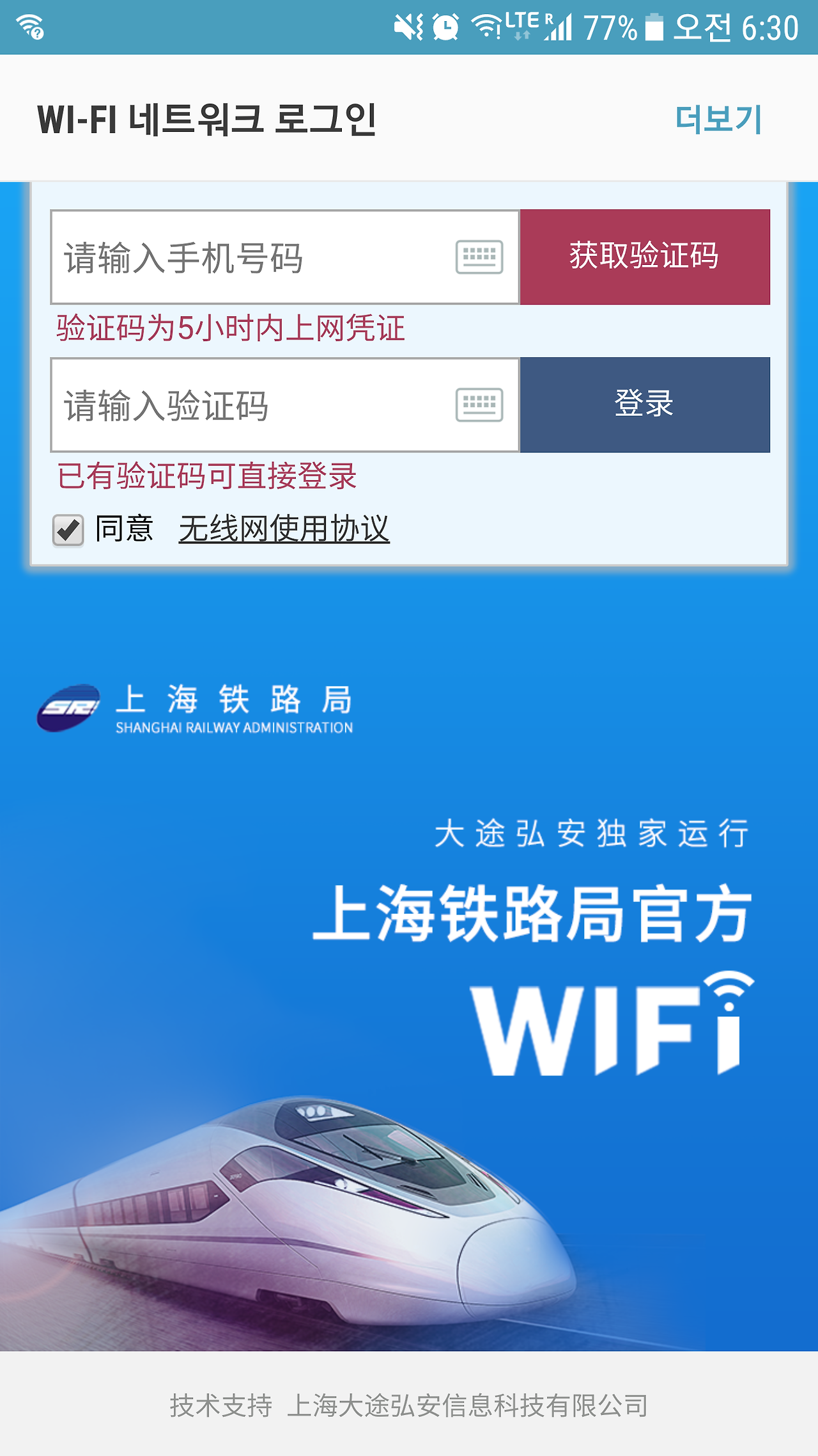 아래 사진은 상해 홍교 역에서 와이파이 접속하려고 했더니 스마트폰에 뜬 화면