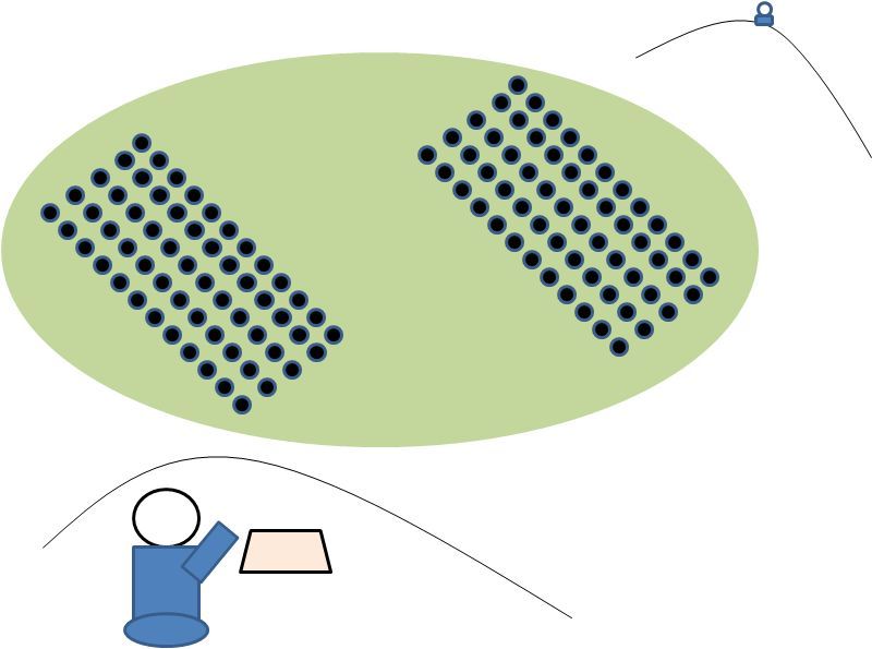 두 번째는 전쟁을 지휘하는 입장이다. 산 위에 올라서 우리 쪽 진영부터 상대편 진영을 바라보는 시점이다. 더 멀리에 상대 진영의 지휘관도 아주 조그맣게 볼 수 있다. 지휘관은 어떻게 하면 전쟁에서 이길 수 있는가를 시시각각 변해가는 전쟁의 양상을 보면서 지도 위에 작은 점들의 방향을 바꾸어본다. 때로는 일부 전투에서 손해를 보는 결정을 하더라도 전체 전쟁을 승리로 이끄는 작전을 짜서 내려보낸다. 그 지시를 받아 참모들은 재빨리 큰 소리 악기로 신호를 보내거나 깃발을 흔든다.