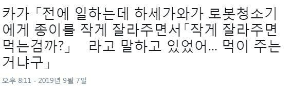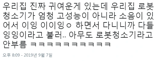 사이트에는 '로봇 청소기'가 언급된 트위터, 인스타그램, 뉴스, 블로그의 상세 내용도 보여주었다. 그중에 가장 빵 터진 것은 아이가 로봇 청소기에 종이를 먹였다는 내용이다. 정말 위에서 말한 움직이는 로봇청소기에게 아이는 동물을 대하는 감정이 느낀 것이다. 그리고 그 아래는 '잉잉이'라는 애칭도 붙여주었다는 내용...