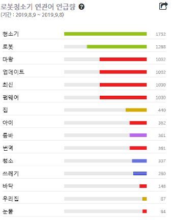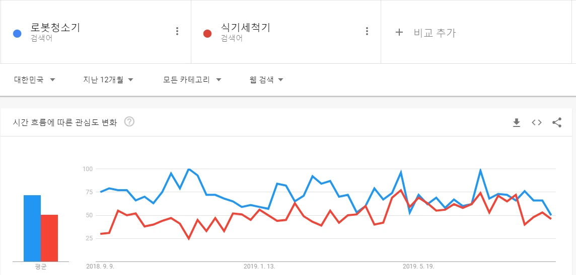 그러면 대략 이 두 가지 키워드는 구글 검색에서 한 달 동안 얼마나 검색을 해 보았을까? 이건 구글트랜드로 살펴보았다. 대략 50~100회 정도 검색이 되었고, 식기세척기보다 로봇 청소기가 더 사람들에게 관심이 많은 걸 알 수 있었다. 연관검색어든 제품명과 연결되어 있어, 위와 같은 감정 표시는 알 수 없었다.