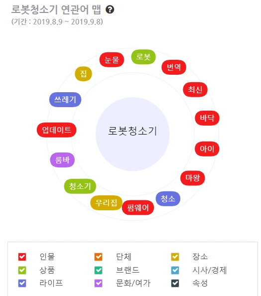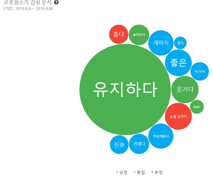 위 사이트에서는 '감성' 분석 기능도 있다. 로봇 청소기에 대해서 긍정, 중립, 부정의 형용사가 보인다. 왜 "춥다"와 "눈물 흘리다"가 로봇 청소기와 같이 언급되었는지는 잘 모르겠다. 다만 "진솔", "귀엽다", "마음에 들다" 란 말이 특별히 인간적인 감정을 로봇청소기에 느꼈기에 나온 말이 아닐까 싶다.