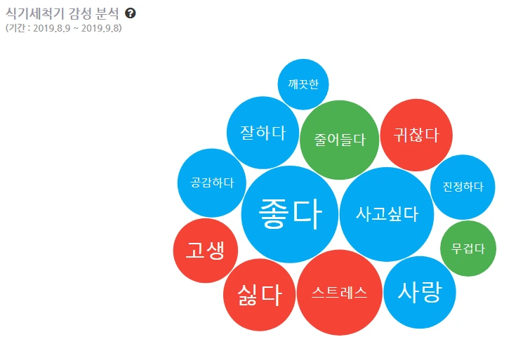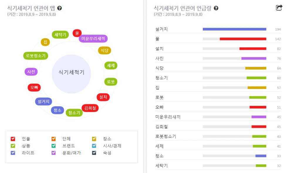 다음은 '식기 세척기'에 대해서 분석 내용이다. 동일한 2019. 8. 9~2019. 9.9 한 달 동안 인터넷에 언급된 내용을 바탕으로 분석한 것을 그래프로 보여주었다.