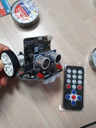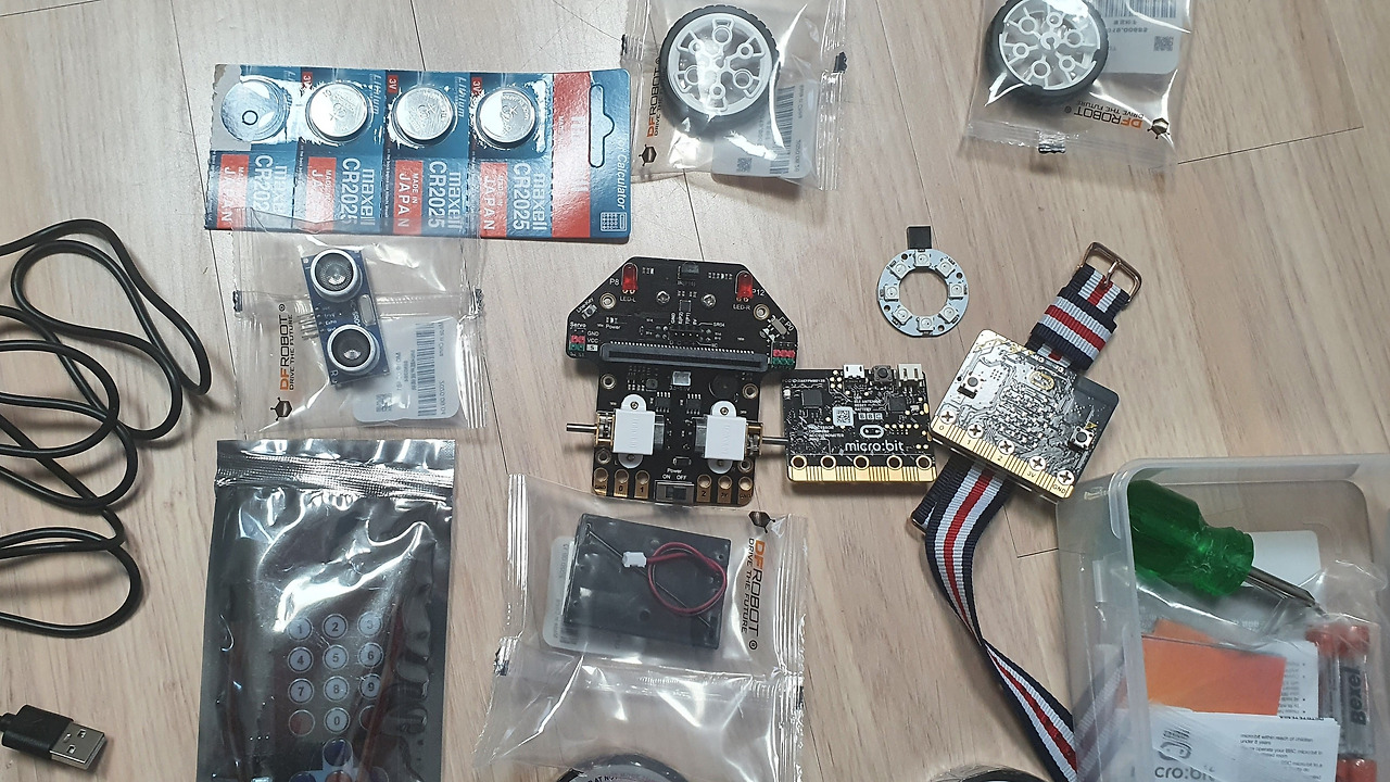 마이크로비트가 2개였고, 하나는 시계처럼 줄이 달려있고, 다른 하나는 자동차를 만들어 끼울 수 있도록 되었다.