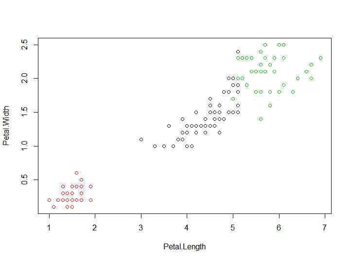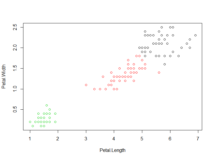 plot(aa[c("Petal.Length", "Petal.Width")], col=kc1$cluster)