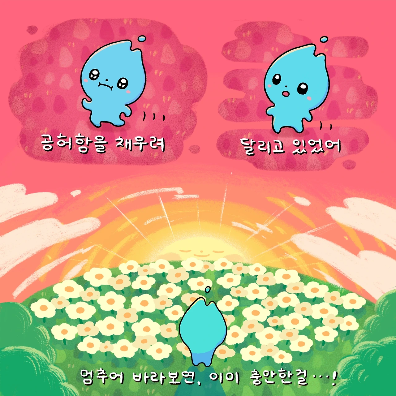 오은영 박사님 말씀처럼, 우리는 잘 나온 시험 점수가 아닌, 끈기 있게 공부한 과정을 기억하죠. 더 많이, 더 빨리 달리면 언젠가는 충만함이라는 뱃지를 획득할 것 같지만, 사실 충만함은 내가 달리던 그 길에, 내가 지나친 주변 풍경에, 나의 달리기 자체에 이미 가득할지 몰라요.
