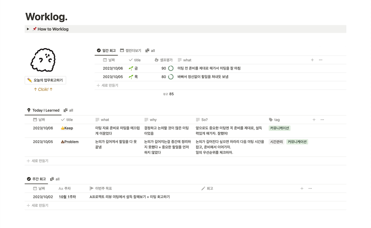 매일 하는 게 가장 중요하다. 위에 말했듯 하루만 지나도 어떻게 일했는지 같은 것은 잊어버리게 되고 쓰기가 쉽지 않다. 매일 쓰는 습관을 들이기 위해서는 무엇보다 쓰기 쉬워야 한다. 너무 복잡하거나 쓸 게 많으면 퇴근하고 싶은 욕구에 지고 만다.