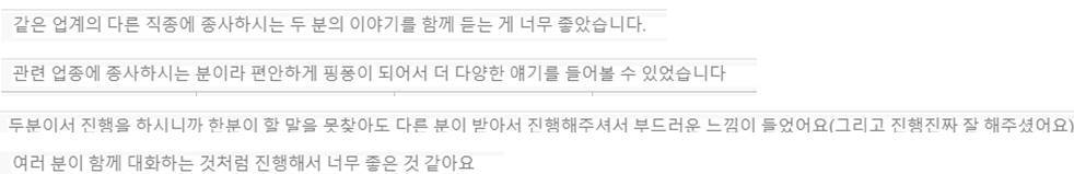 '대담' 형식에 대한 반응이 좋았다. 일방향적인 전달이 아니라, 자연스러운 소통을 기반으로 더욱 풍성한 전달력을 확보할 수 있었다. 강연은 유투브 라이브로 진행되었으며, 실시간으로 학생들의 질문들 수렴해 중간중간 충분히 소화해나갔다. 들어온 질문은 모두 피드백을 해준다는 목표를 가지고 예민하고 성실한 쌍방향 소통을 잊지 않았다.