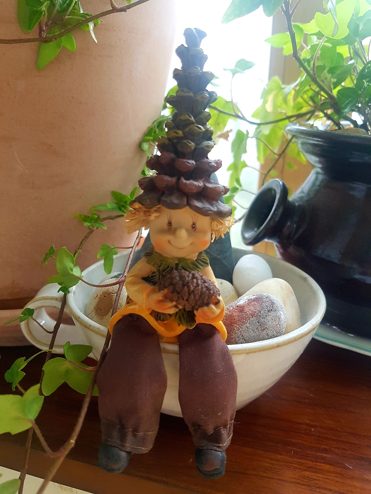 내가 컵 안에 쌓아둔 돌산에 앉아서 당신이 떠나온 그곳을 그리워하는 것 같아요. 친구라도 데려올 걸, 너무 외롭게 했어요. 솔방울 모자를 쓴 당신은 높은 데 걸터앉는 걸 좋아하지요. 창틀에 선반에 앉아서 먼 곳을 바라보네요. 손에는 오리나무 열매를 들고서 당신이 살던 알프스 산자락 통나무 집 샬레를 찾아가고 싶은 거겠죠.
