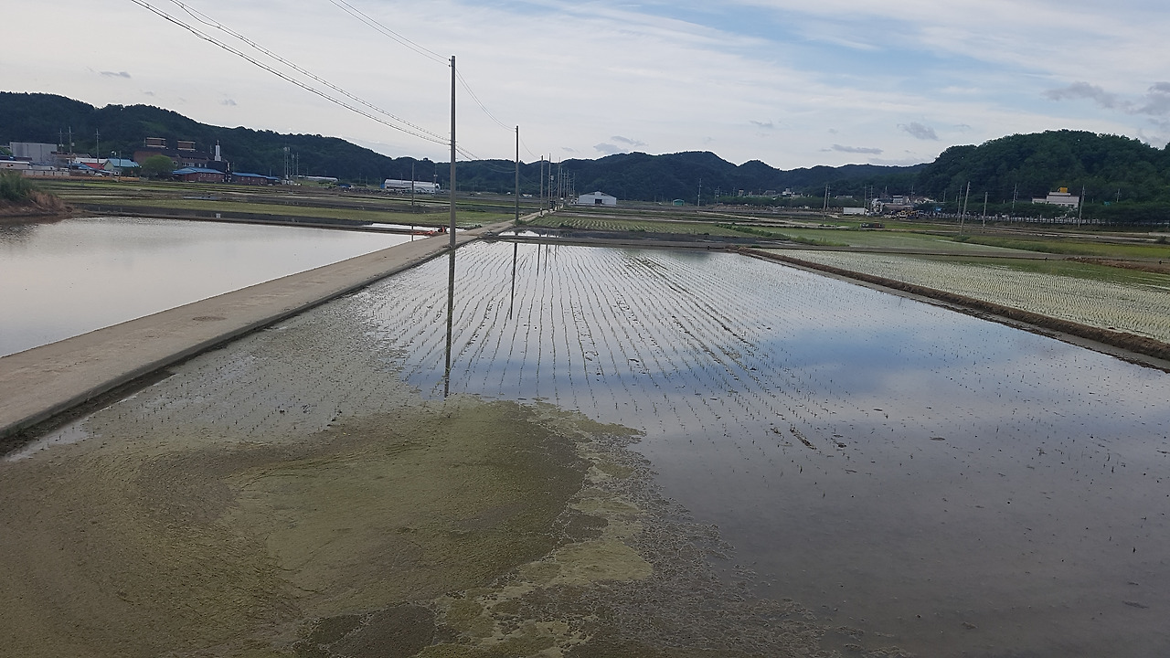 엷은 구름막 뒤로 숨어서 보이지 않는 아침 해를 찾아서 들길 위로 올라섰다. 일찌감치 봄비를 말려버린 대기와 대지는 온통 푸석거리는 흙먼지투성이, 구두 발등 위로 뽀얗게 먼지가 내려앉는 길과 달리 모내기가 한창인 논배미에는 물꼬를 튼 논물이 찰방찰방 넘실거린다. 바싹 마른 가뭄에도 이 너른 들판을 먹여 살리는 용당골 지하수가 저 건너편에 대대손손 자리 잡은 이상 물 걱정은 접어두는 은혜로운 땅. 논골 갯내음에 파묻혀 간밤에는 개구리들이 와글와글 울어댔는데 또다시 생명을 먹여 살리는 질퍽한 들판 위로 구름 조각배를 띄운 하늘이 내려와서 잠겼다.