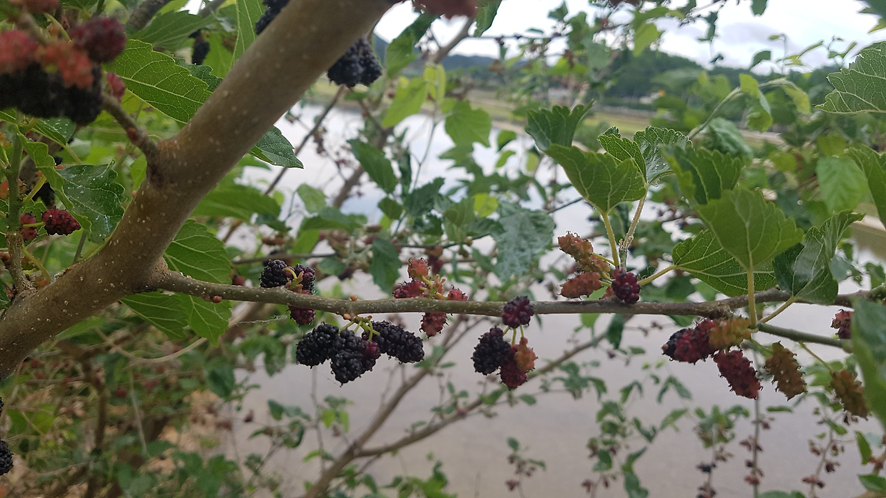 들길에는 산딸기 오디가 한창이다. 짙은 보라색 오디 두세 알을 손가락 마디에 물들여가며 따먹었다. 특유의 향내가 나면서 달콤하다. 오디를 따 먹을 때면 언제나 두리번거리게 된다. 동네 뒷산에는 계단식 뽕나무밭이 있었다. 이 무렵 뽕나무들은 시커먼 오디를 금단의 열매처럼 장식해놓았다. 그걸 놓칠 리 없는 동네 아이들이 작은 손아귀를 뻗쳐 한 줌 따먹은 입가에는 보랏빛 물이 들어 금세 티가 났다. 뽕나무밭주인 달수 할배는 뒤늦게 지팡이를 들고 나타나서 노발대발 소리쳤다. 지금도 그 소리가 귓가에 쟁쟁하게 맺혀있다. 할배한테 붙잡히면 죽을 것 같았다. 그때 저린 가슴이 누가 뭐랄 것도 없는 오디 열매를 앞에 두고서 망설여진다. 한 알, 두 알. 더 이상은 못 먹겠다.