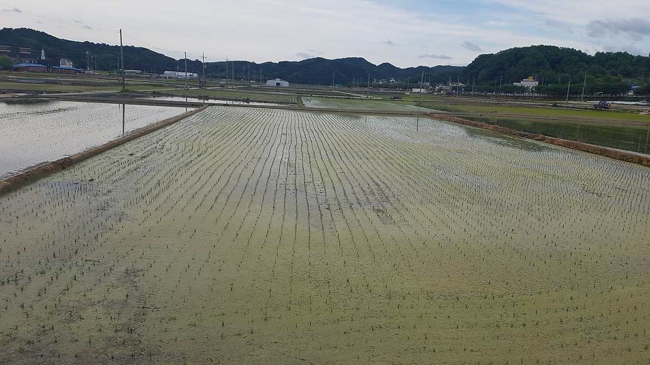 고향 들판, 나란히 줄을 맞춘 모심기가 진행되고 있다