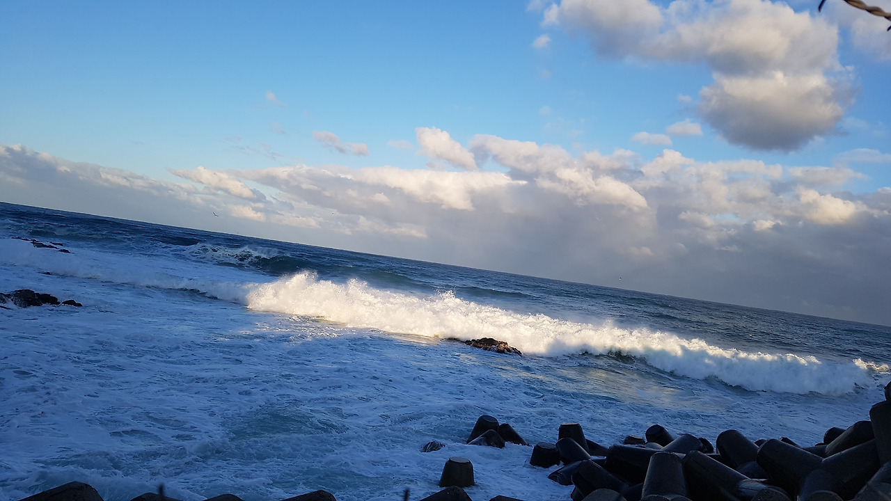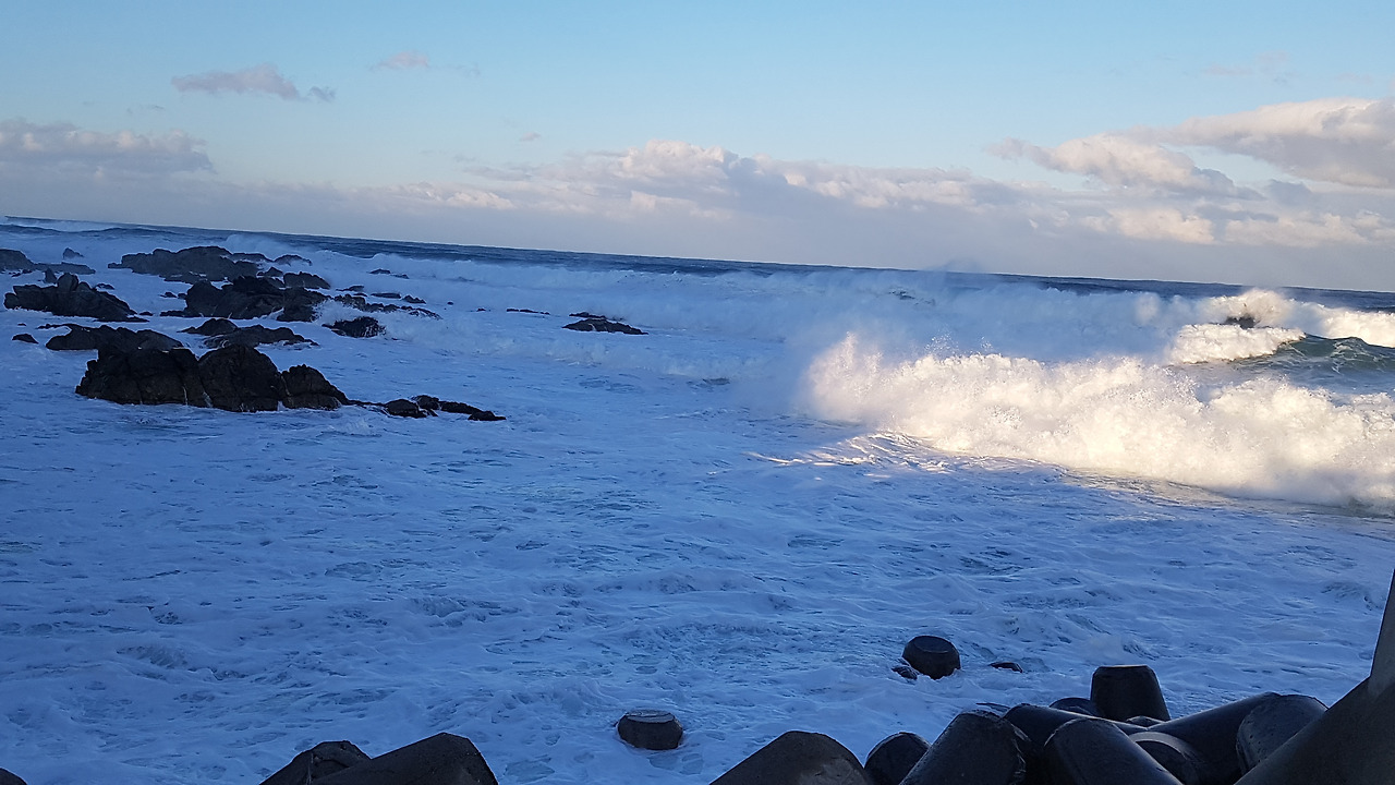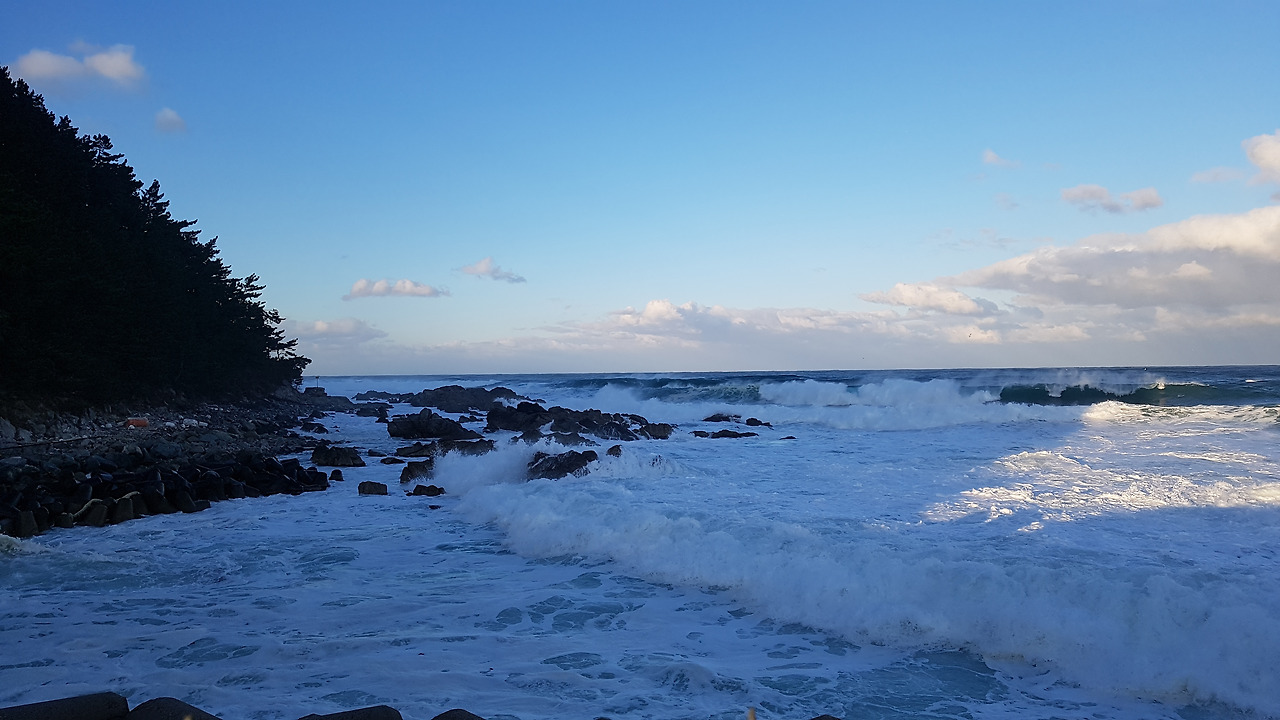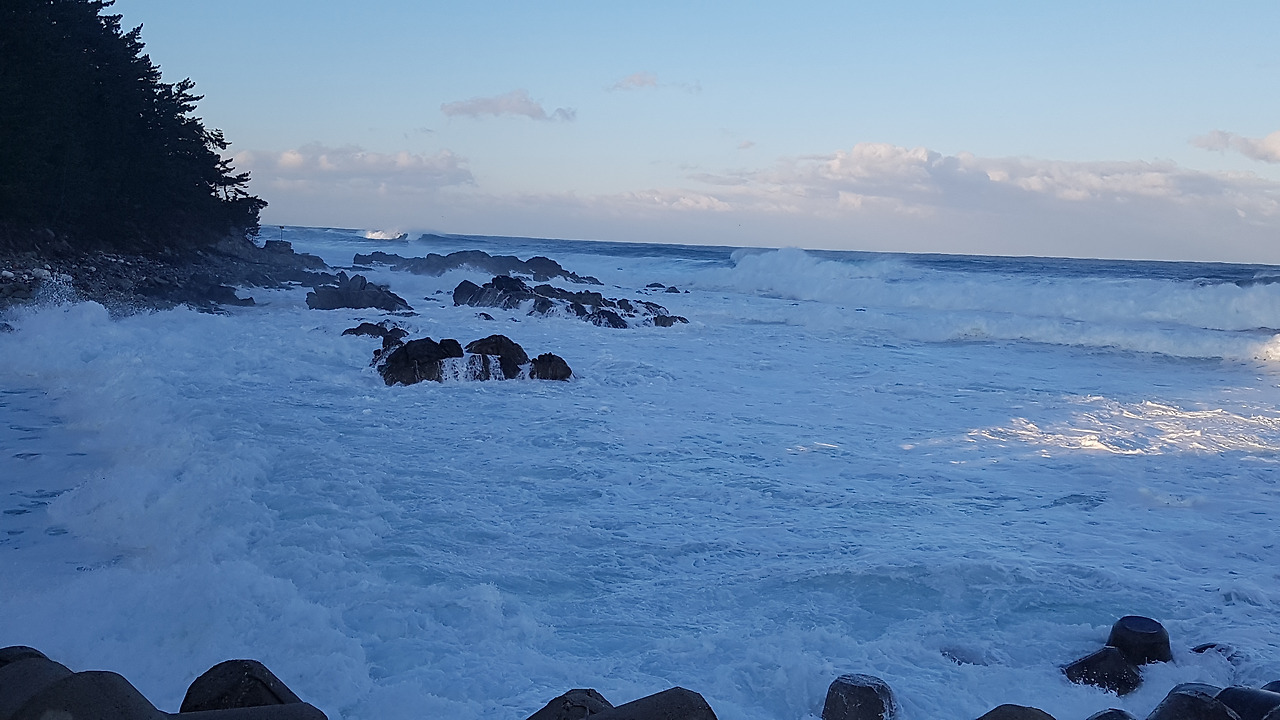 경사지로 바짝 다가서자 흰 거품을 게우는 파도가 거세다.