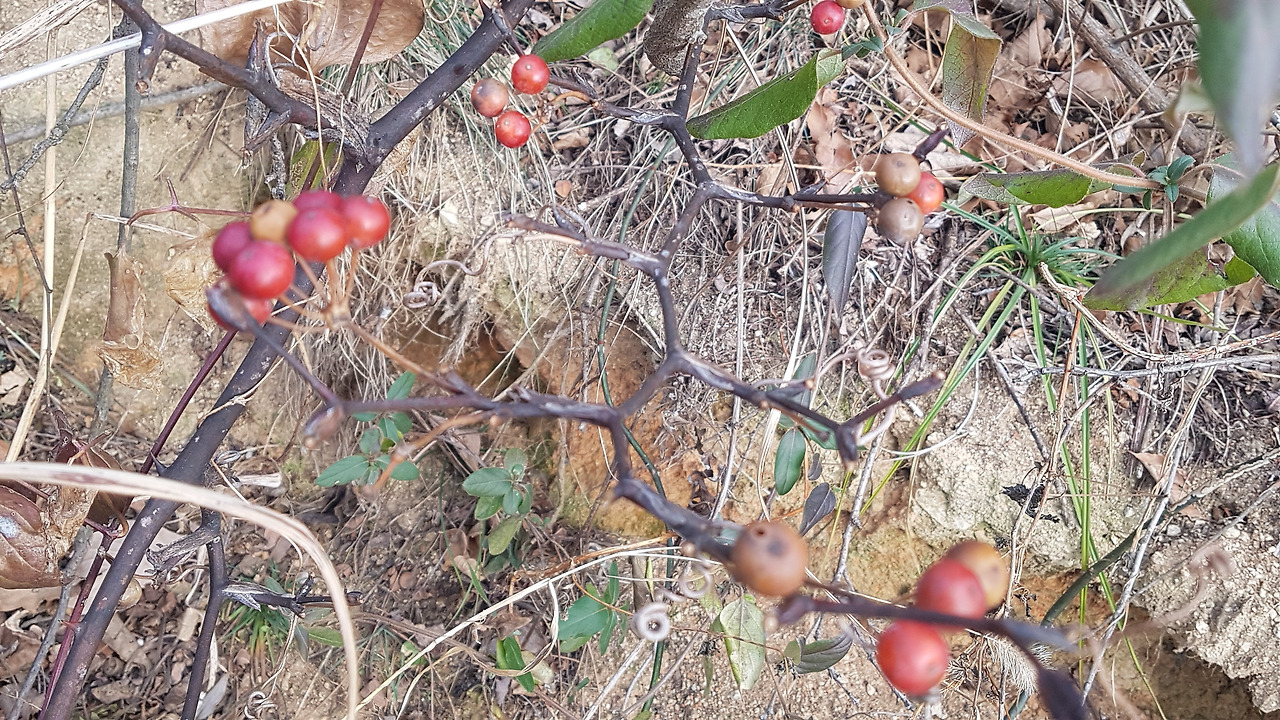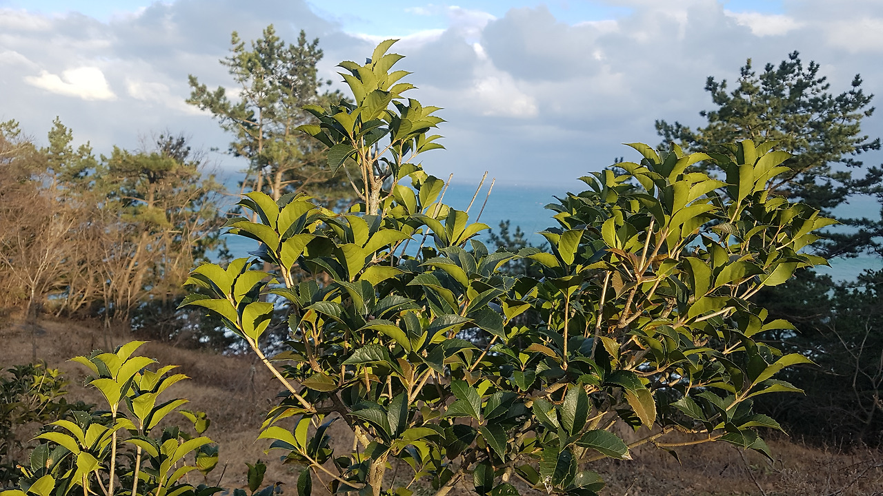 들길에서 불과 십여 분 올라설 뿐인데 들판이 저지대로 내려가 보이고 알록달록한 어촌 지붕들이 삿갓조개가 군집한 바위처럼 보인다. 그 너머 수평선은 언제나 평정심을 잃지 않고서 하늘과 땅의 마찰을 중재하는 완충 역할을 수행한다. 길가에는 어릴 적 보았던 맹감나무 덩굴(청미래덩굴)이 얽혀있다.