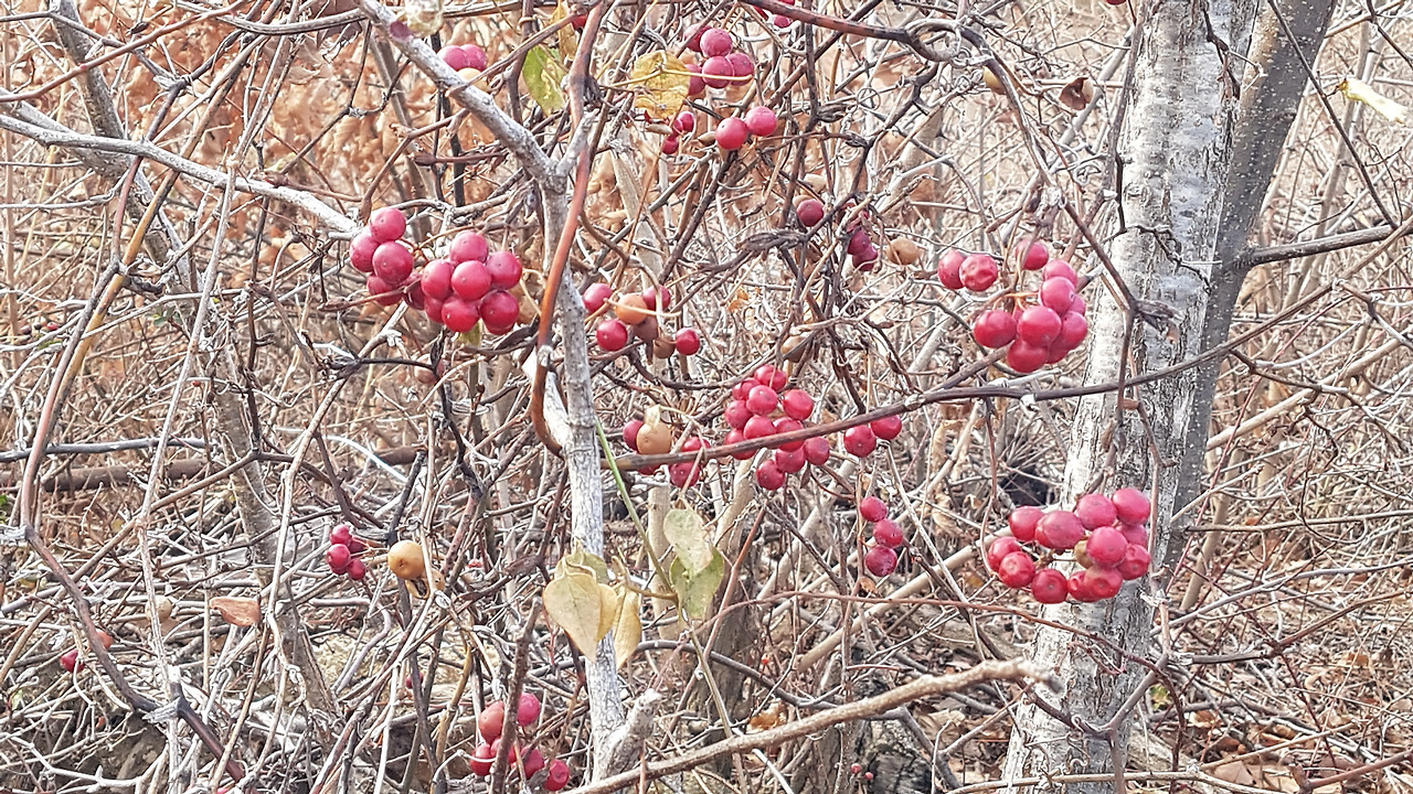고향 말로 ‘깜바구’라 불리는 새빨간 열매를 매달고서. 크리스마스 장식품으로 손색이 없다. 초록잎이 무성한 여름철 깜바구는 연한 녹색을 띤다. 시큼한 맛이 나는 깜바구를 두 눈을 질끈 감으며 씹곤 했었다. 가을이 되면서 발그스름 익어가면 단맛이 난다. 어릴 때는 참 흔했었는데 지금은 눈에 거의 띄지 않는다. 오염에 민감한 환경 지표식물 같다. 내가 사는 수도권에서는 이 식물을 단 한 번도 본 적이 없으니까.