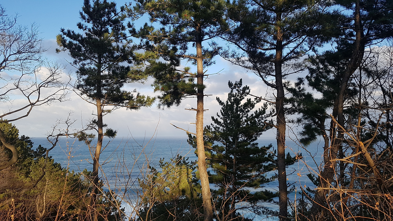 산길을 내려가자 길은 바닷가 바로 옆 산으로 이어진다. 오후 햇빛이 유난히 쏟아지는 산 중턱에 이르자 새파란 풀들이 한겨울에도 소복하게 자란다. 기온은 영상 6도, 따스한 숨결이 모여 바람도 비껴가는 이곳은 봄. 수액이 오른 청매화 가지에 초록빛 움이 돋아 오르고 엷은 미색 꽃눈이 드문드문 맺혀있다. 양기를 품은 양지인가 보다.