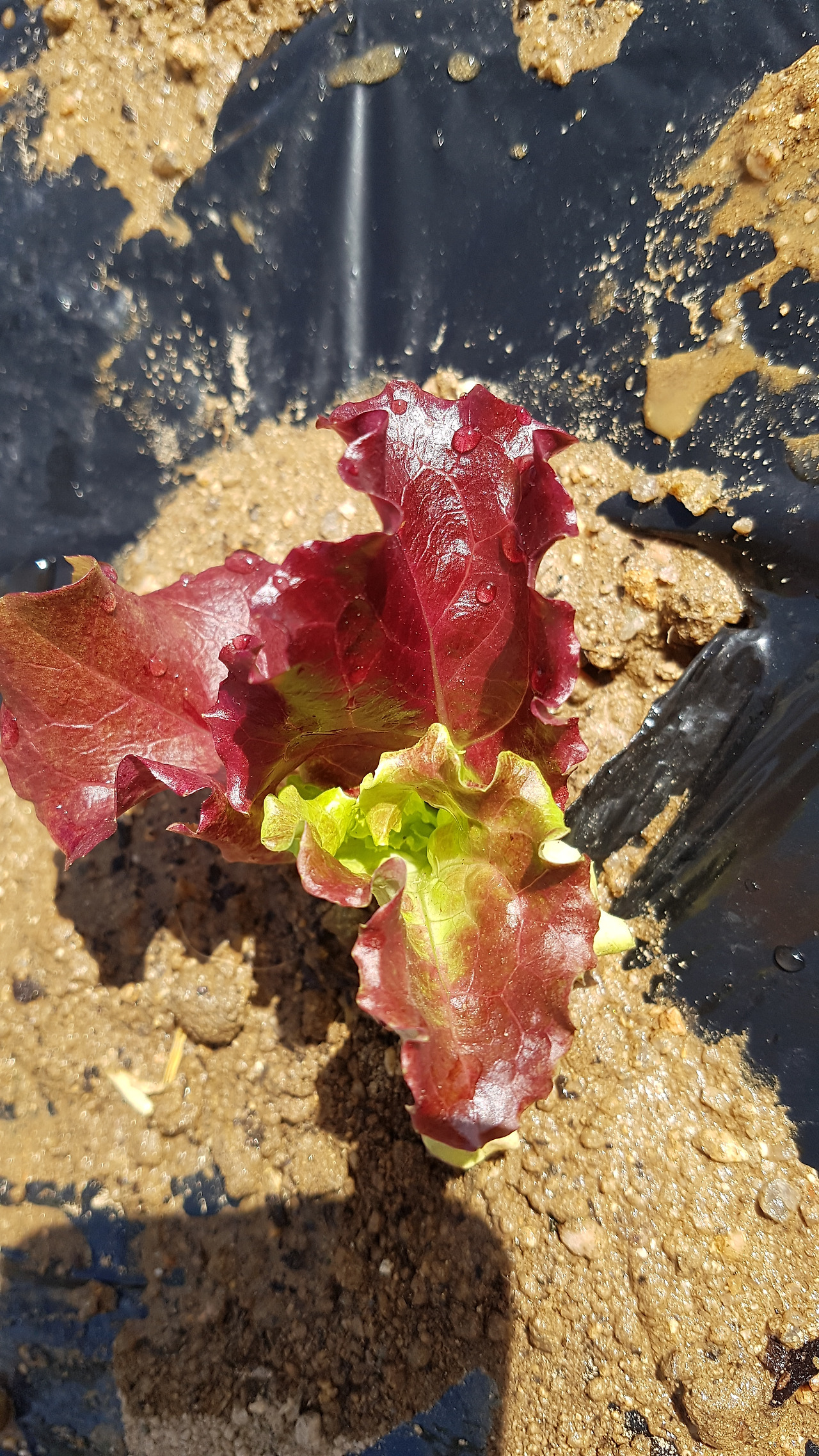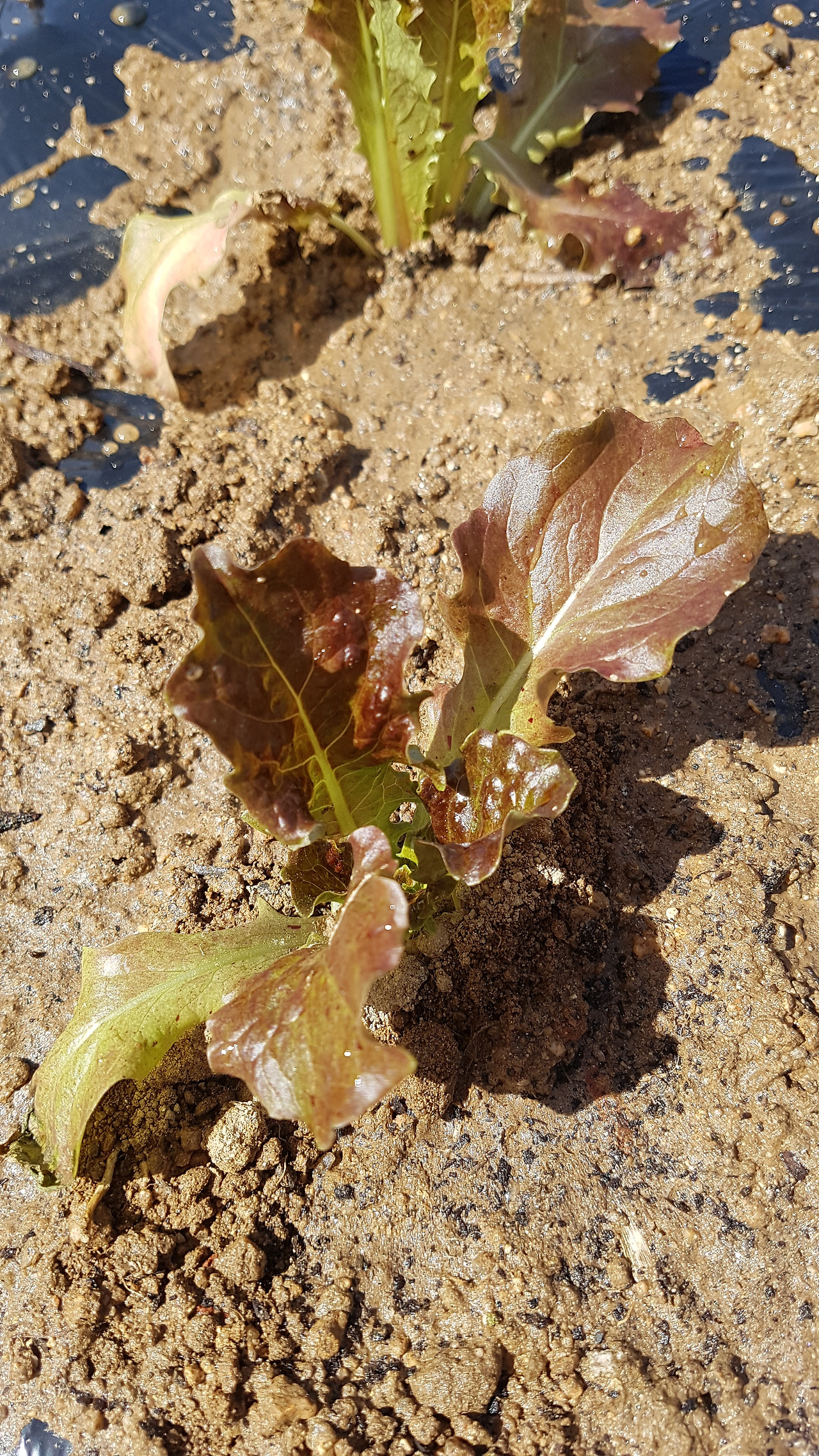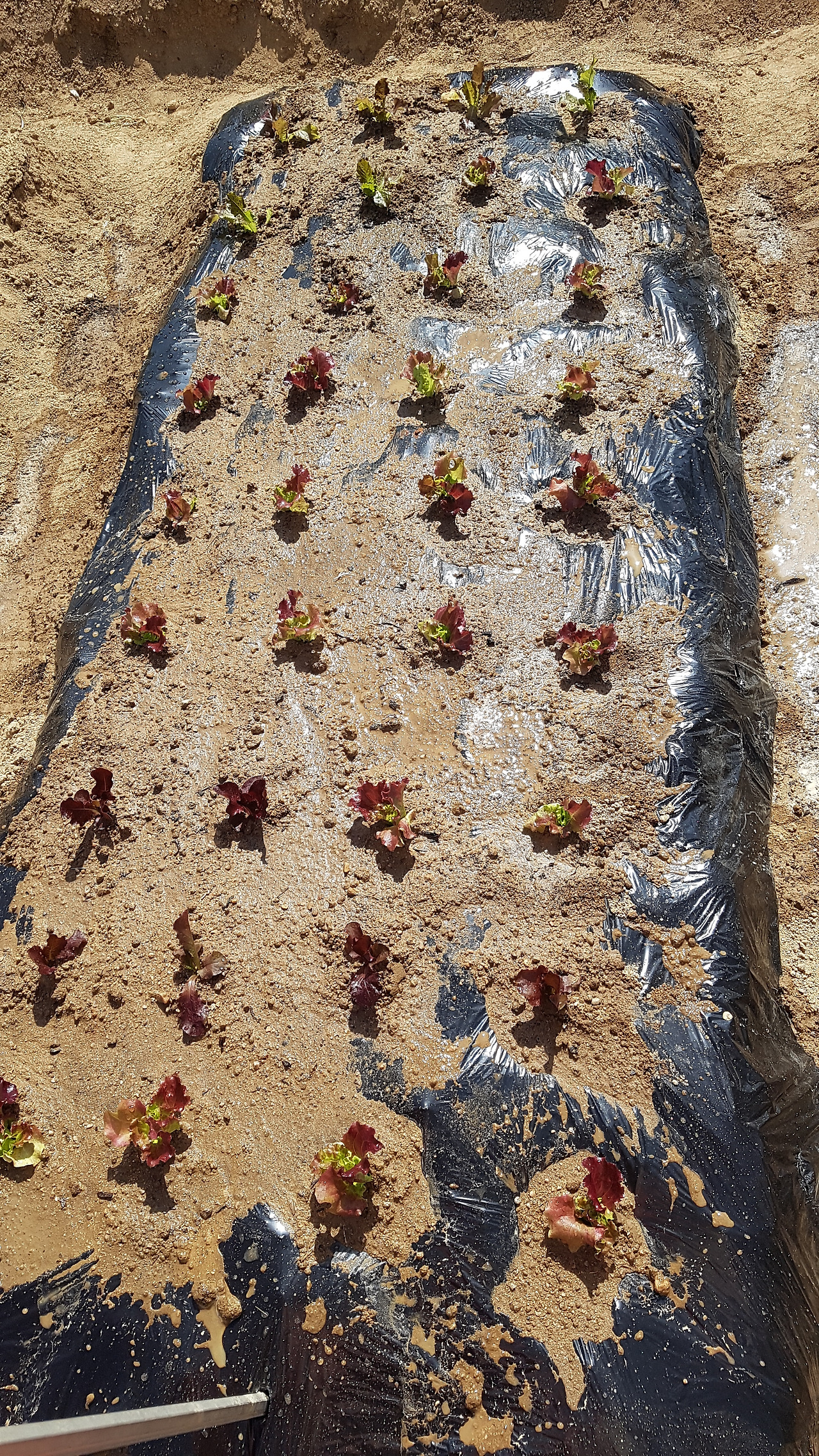 꽃삽으로 비닐을 십자형 흠집 내고 흙을 파낸 뒤 모종을 자리 잡아 넣고서 흙으로 다시 덮어준다.