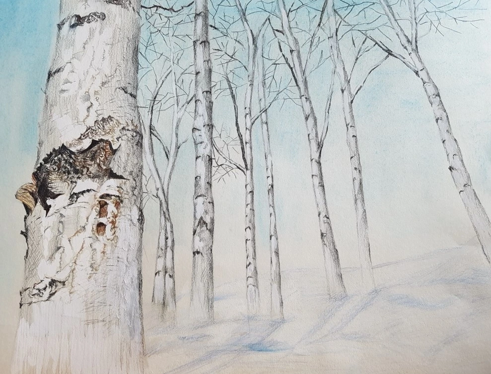 겨울 숲 속에 우뚝 선 자작나무 한 그루의