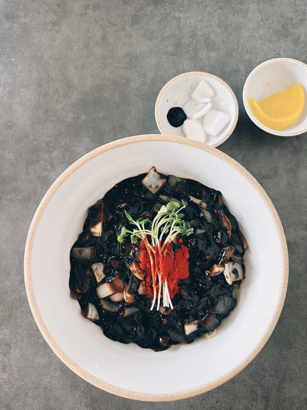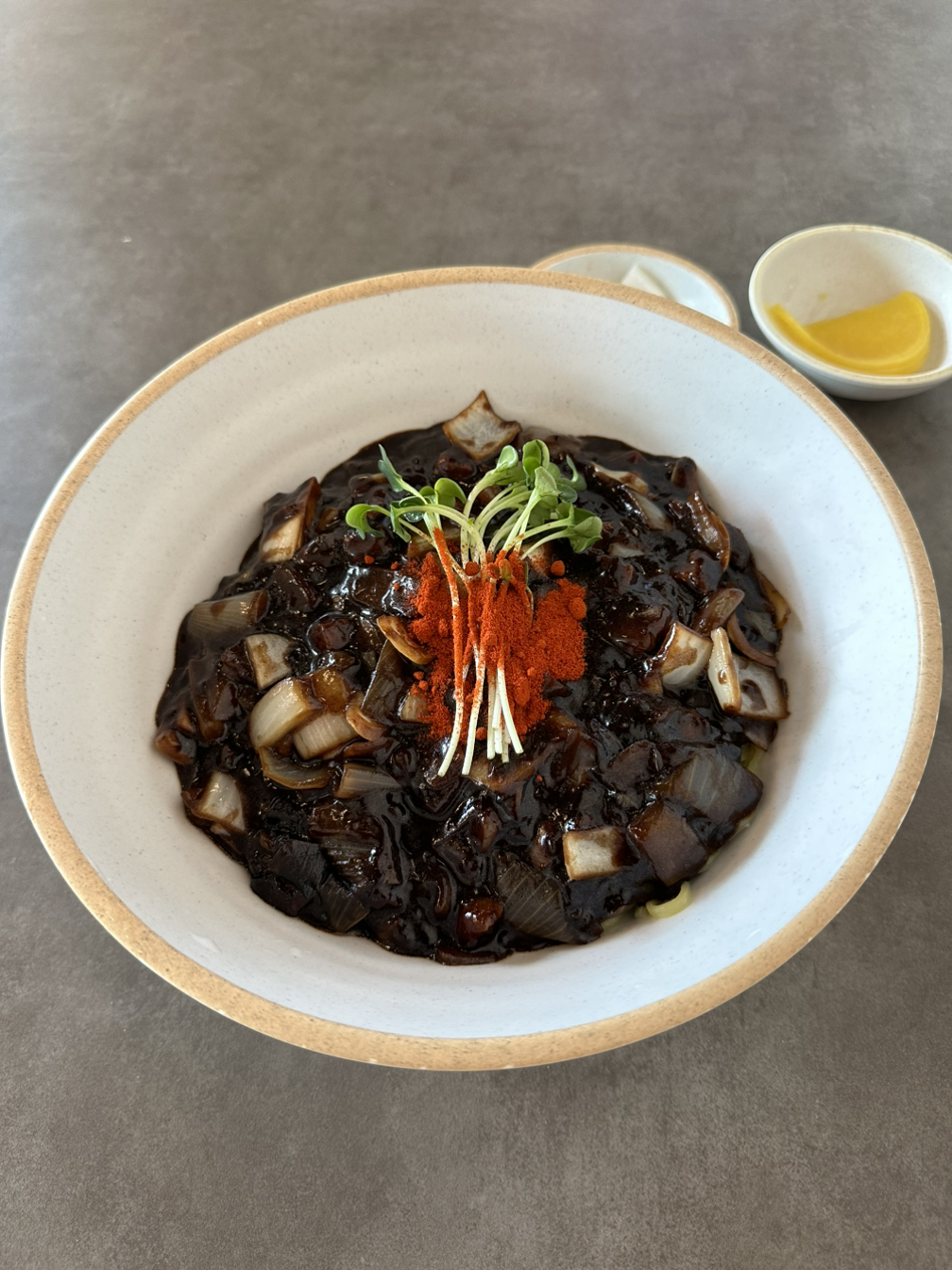 어찌 되었건 주문을 마치고, 물을 마시고 단무지에 식초만 적셔서 씹어대다가 짜장면이 나온다. 그릇부터 좋다, 깊고 크고 좋다. 데코도 나쁘지 않다. 면발도 쫄깃하게 잘 삶아진 것 같다.