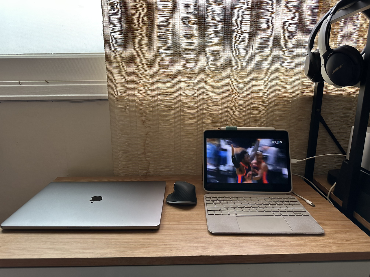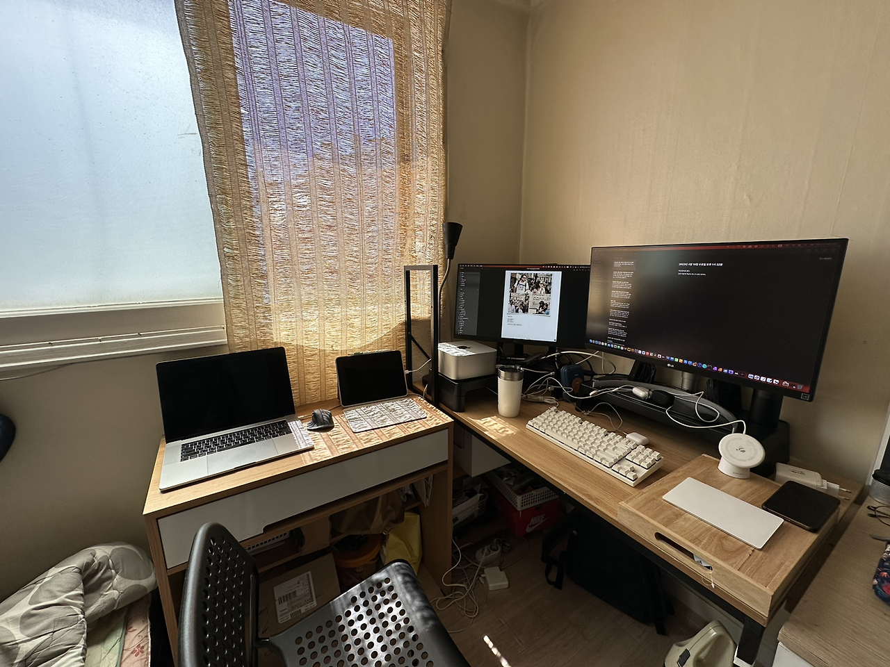 테이블을 하나 더 들여서 갈 곳 잃었던 맥북과 아이패드를 올려놔봤다. 그리고 저기는 그냥 간이식탁으로도 훌륭하게 쓸만했다.