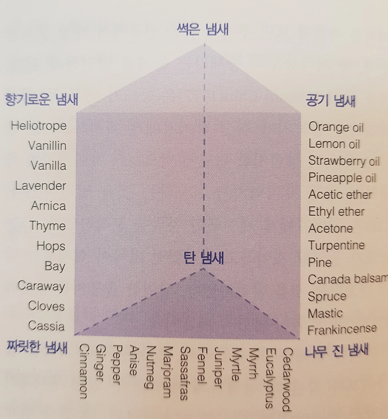 *냄새의 정체, 냄새의 이름을 알면 냄새에 대한 지각이 바뀐다. 우린 '여름의 냄새' 여름이 가지고 있는 냄새의 이름들을 너무나 잘 알고 있다. 1916년 Henning은 '냄새 프리즘'이란 걸 제안했다.