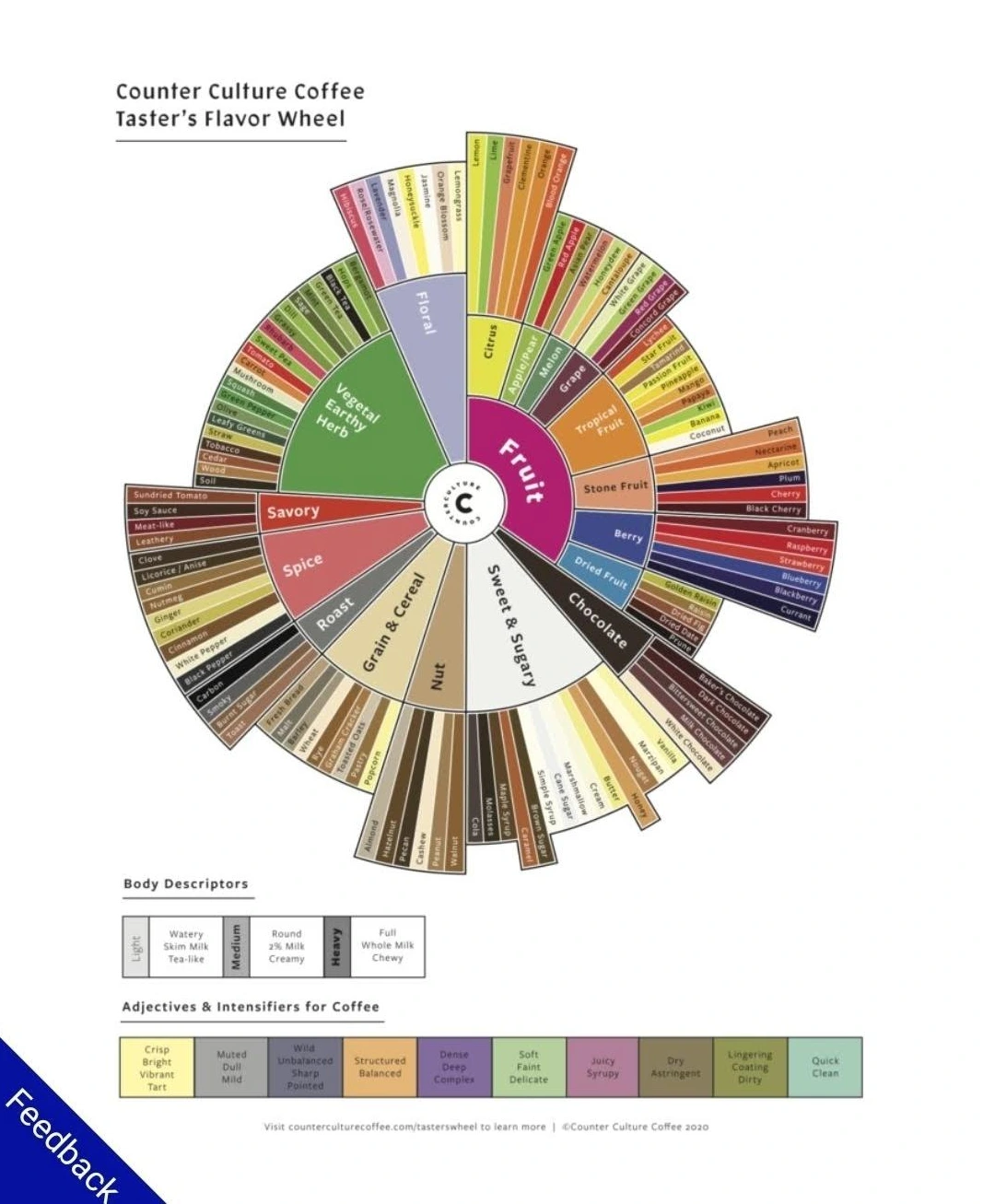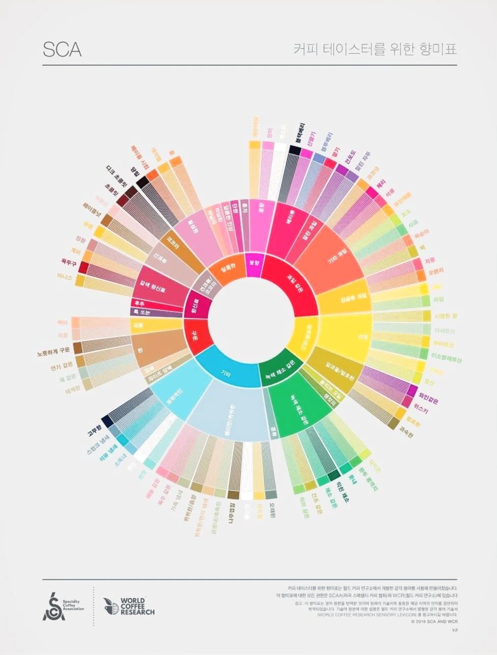 출처: SCA홈페이지에서 9.99$에 구매한 한국어 버전 커피 플레이버 휠저게 다가 아니지만, 현재 커피에서 나는 맛과 향에 대해서 세계커피협회가 잡아놓은 기준이 되는 표이다. 카운터 컬처 커피에서도 플레이버 휠을 만들어 홈페이지에서 무료로 나누고 있는데 아래 표이다. 커피협회에서 만든 플레이버 휠보다 좀 더 촘촘하고 직관적으로 만들었다. 하지만, 역시나 아직도 커피의 냄새는 미지의 영역이 많다.